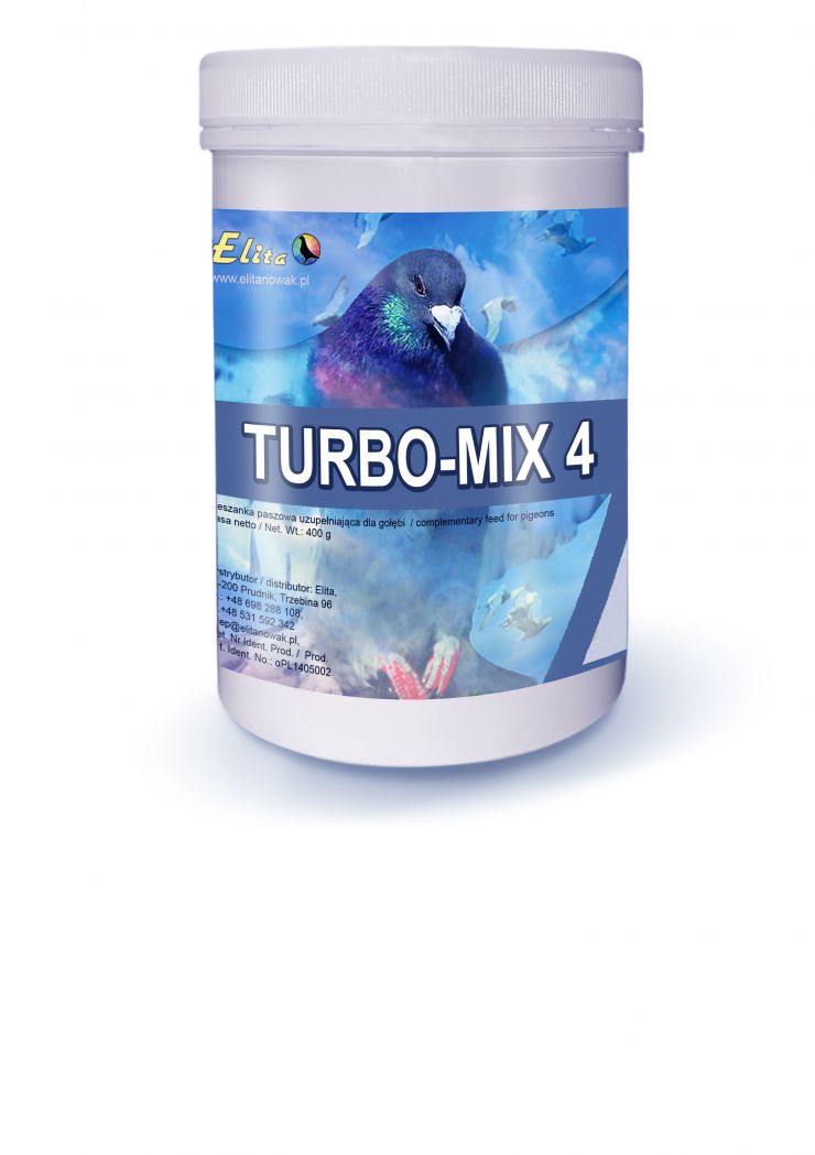 Комбинация вышеупомянутых веществ очень интенсивно работает в процессе хранения и восстановления энергии в теле голубя. Кроме того, он предотвращает жир во внутренних органах. Turbo-Mix-4 расширяет мышечную силу, позволяя более длительно и более интенсивному усилию. Это вызывает меньшую продукцию молочной кислоты во время упражнений и, следовательно, меньше мышечной усталости. Добавление лецитина улучшает память, облегчает концентрацию, поддерживает физическую и умственную производительность организма, снижает нервозность и усталость. Биотин поддерживает энергетическую трансформацию в печени - создание и выпуск инвентаризации энергии.