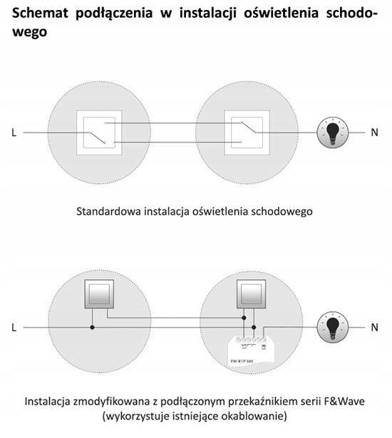 Старые и традиционно установленные электроустановки не означают отказа от удобства дистанционного управления освещением. Многофункциональные радиореле одноканальное FW-R1P-NN и двухканальное FW-R2P-NN монтируются в коробке под кнопкой. Реле подключаются последовательно с управляемой нагрузкой, что означает, что для их работы не требуется подведение нейтрального провода к кнопочному блоку.