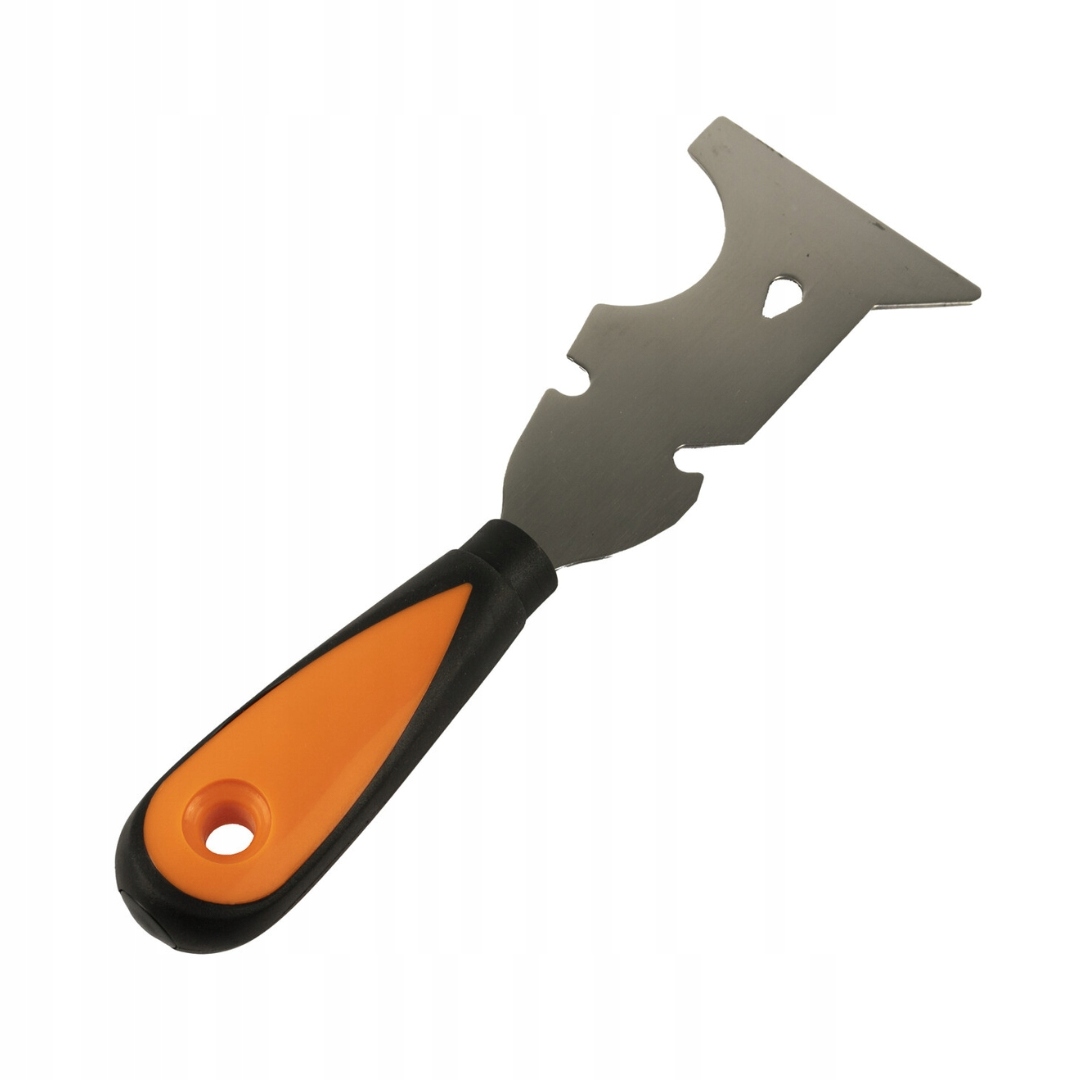Верхняя часть может быть использована в качестве краски или штукатурного скребка, закругленная часть отличная как инструмент для очистки роликов для рисования, следующей функцией является открытие банок с краской и бутылками, среднее отверстие используется для вытягивания ногтей.