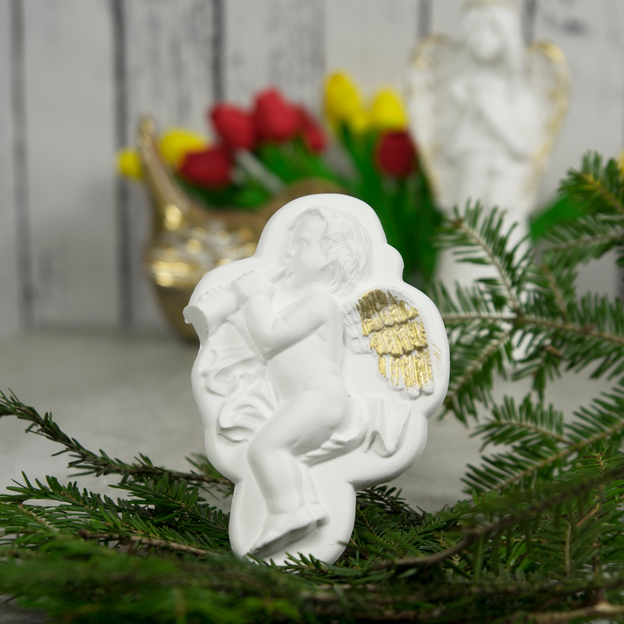 Плоский ангелочек из гипса с пропиткой. Он восхищает своим оригинальным видом.