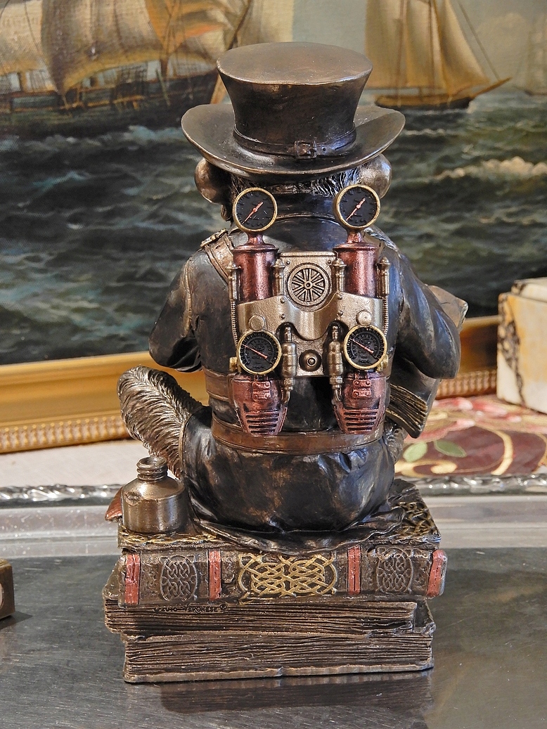Приглашаю вас купить замечательную, необычную фигурку шимпанзе в шляпе по книгам, воздухоплавателя со всем снаряжением, читающего что-то о конструкции воздушного шара. Стиль отсылает к гравюрам в книгах Жюля Верны, фэнтези 19 века. Коллекция "Стимпанк".