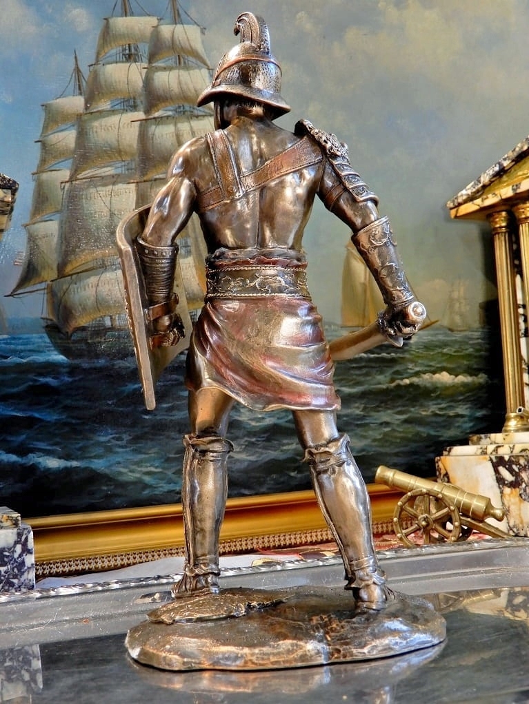 Приглашаю Вас приобрести замечательную статуэтку с изображением римского гладиатора. Фигурка полна динамики, очень выразительна и предельно точно сделана. Изделие выполнено из конгломерата смолы и алебастра, покрытого слоем бронзы.