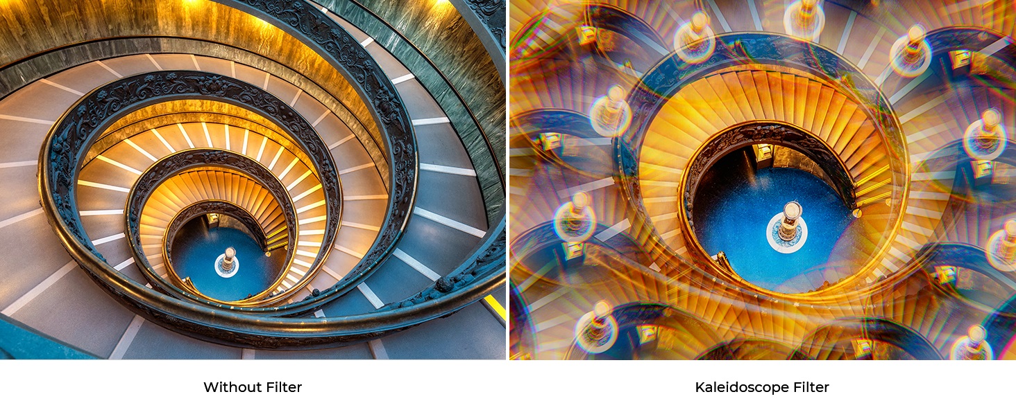 Калейдоскопический фильтр позволяет преломлять одно изображение несколько раз в зависимости от фокусного расстояния. Характерное наложение изображений создает оптические иллюзии, что является желаемым эффектом в художественной фотографии, красоте, гламуре, фильмах, музыкальных клипах, ночных сценах и рекламе.