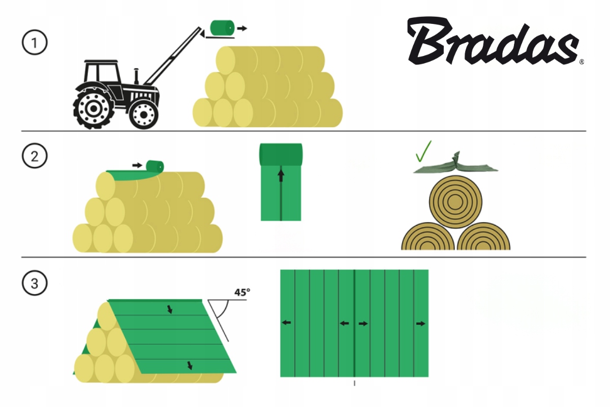 fliz имеет специальную строчку, определяющую центр ширины - это значительно облегчает распространение материала на стог. Рекомендуемая установка под углом 45 ° обеспечивает эффективную дренаж воды. Гладкая страница должна придерживаться тюка и грубого - быть направленной снаружи.