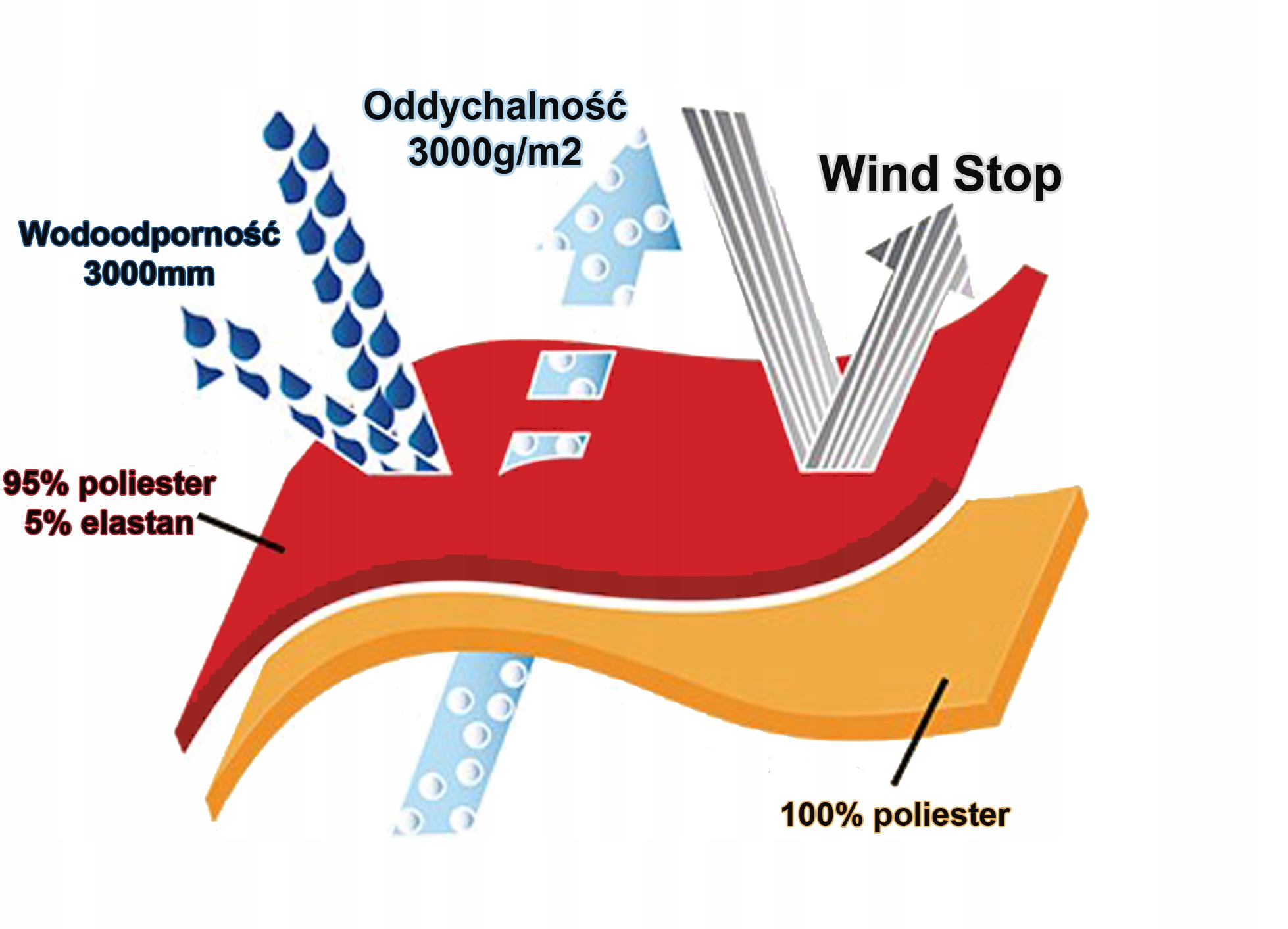 Водостойкость: 3000 мм. Воздухопроницаемость 3000 г/м2. Ветрозащита.