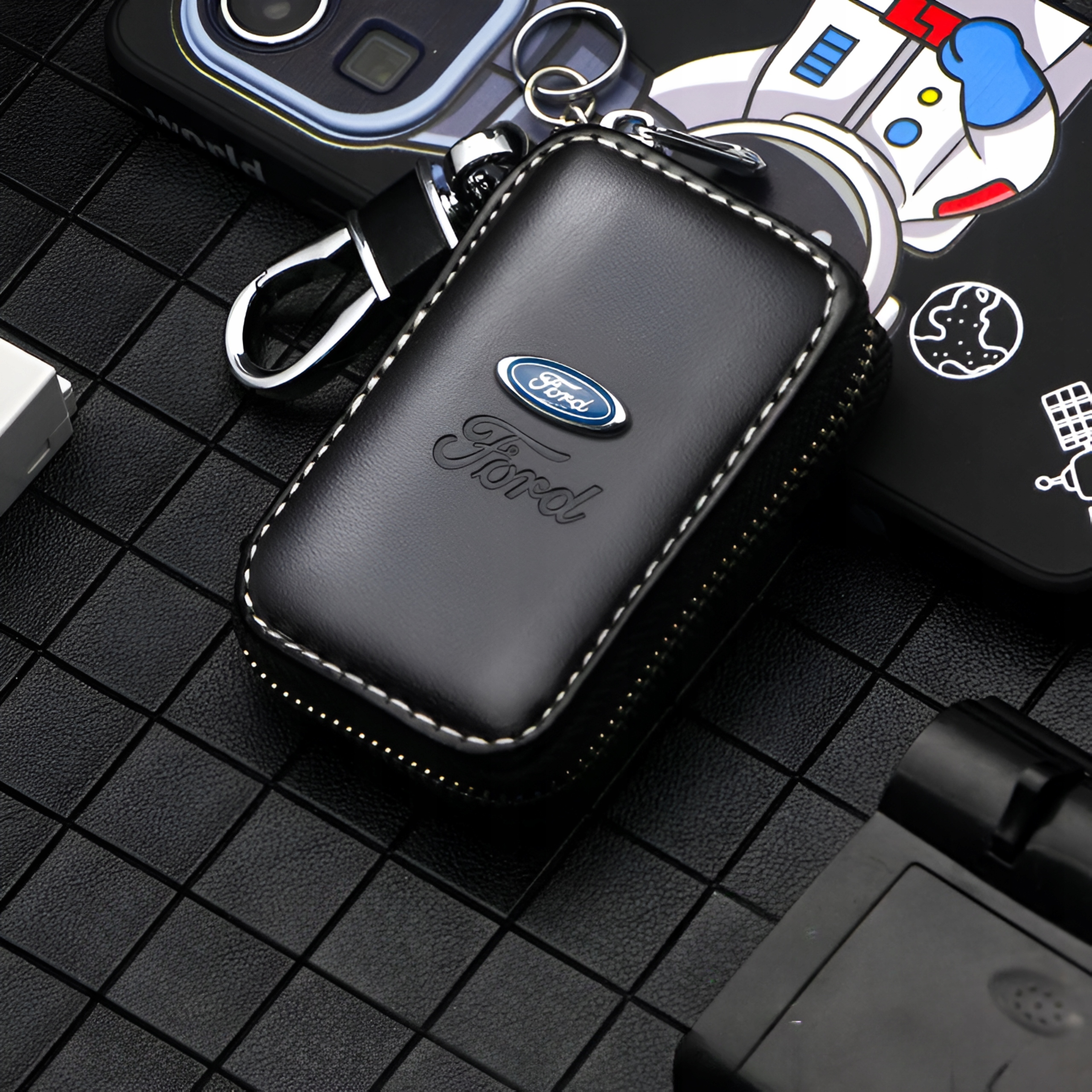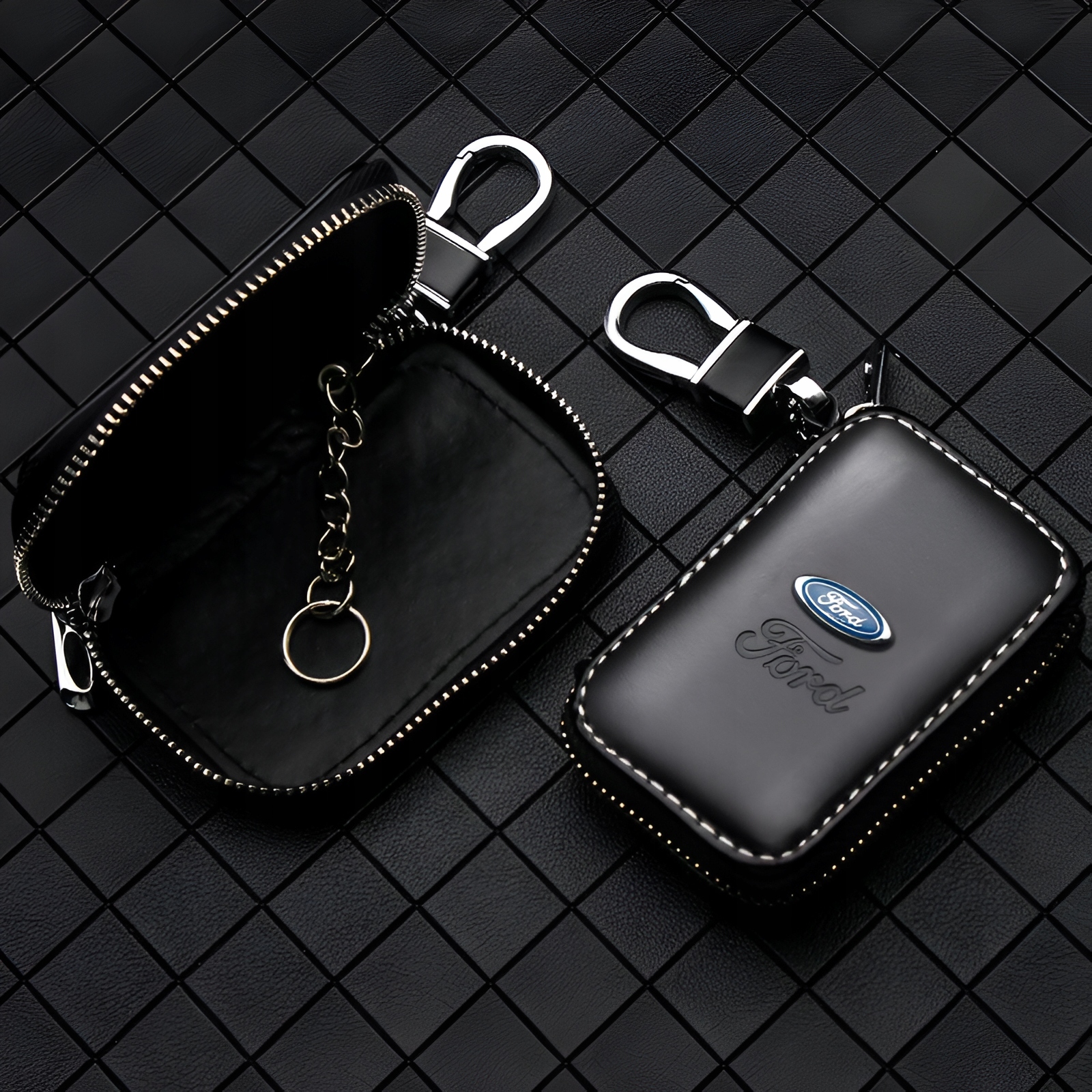 Sasket, изготовленный из щедрой эко -лицевой , обрезанный белой нитью, серебряные акценты добавляют классы, а все украшено логотипом и надписью Ford спереди.