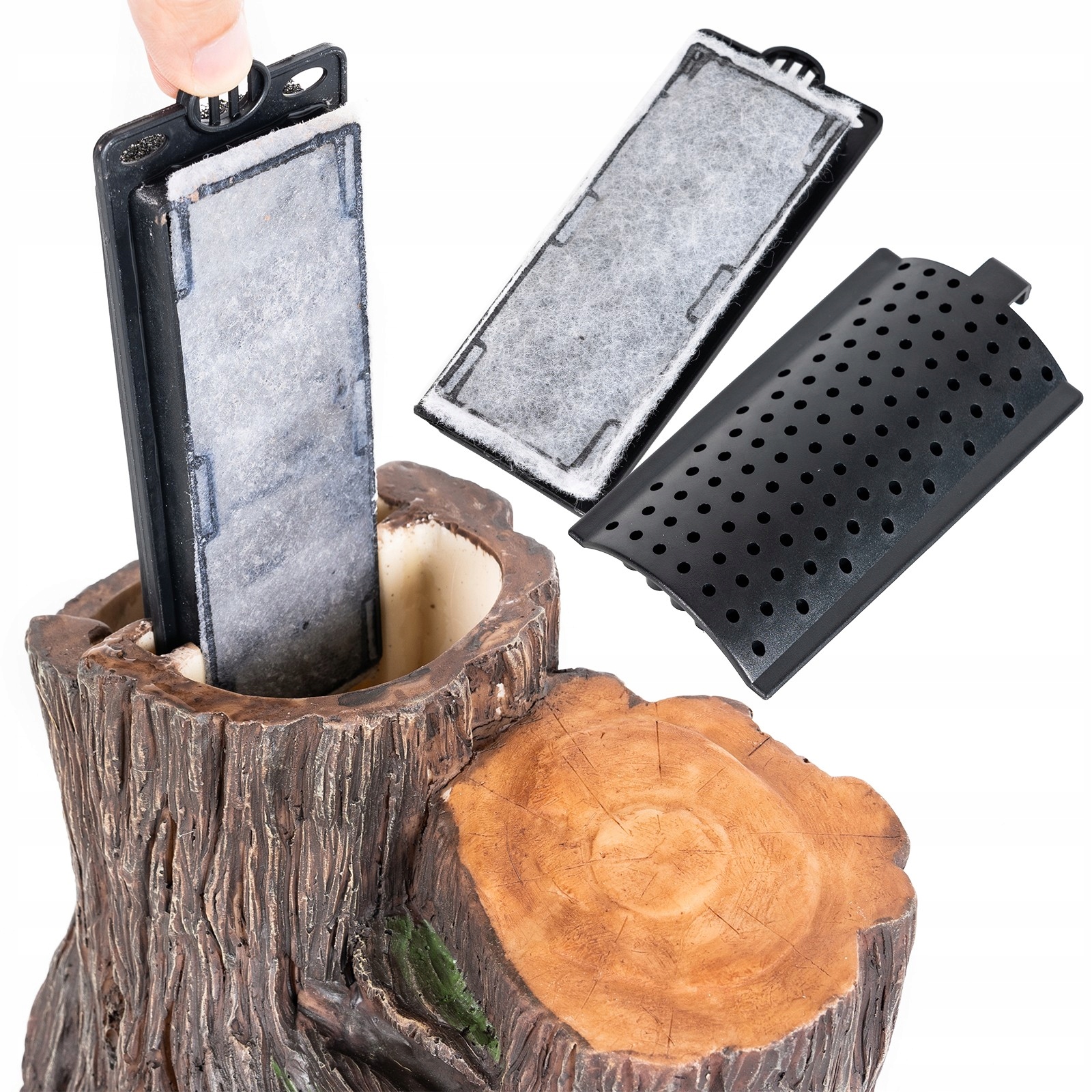 Насос с емкостью 200 л/ч находится внутри корня. Внизу существует предварительный фильтр с губкой, которая останавливает большую грязь, и в верхней части острова - легкодоступная система фильтров: механический фибрин, активированный углерод и вставка, поддерживающая развитие нитрификационных бактерий. Очищенная вода течет сверху и эффективно течет в водопаде, создавая естественную циркуляцию.