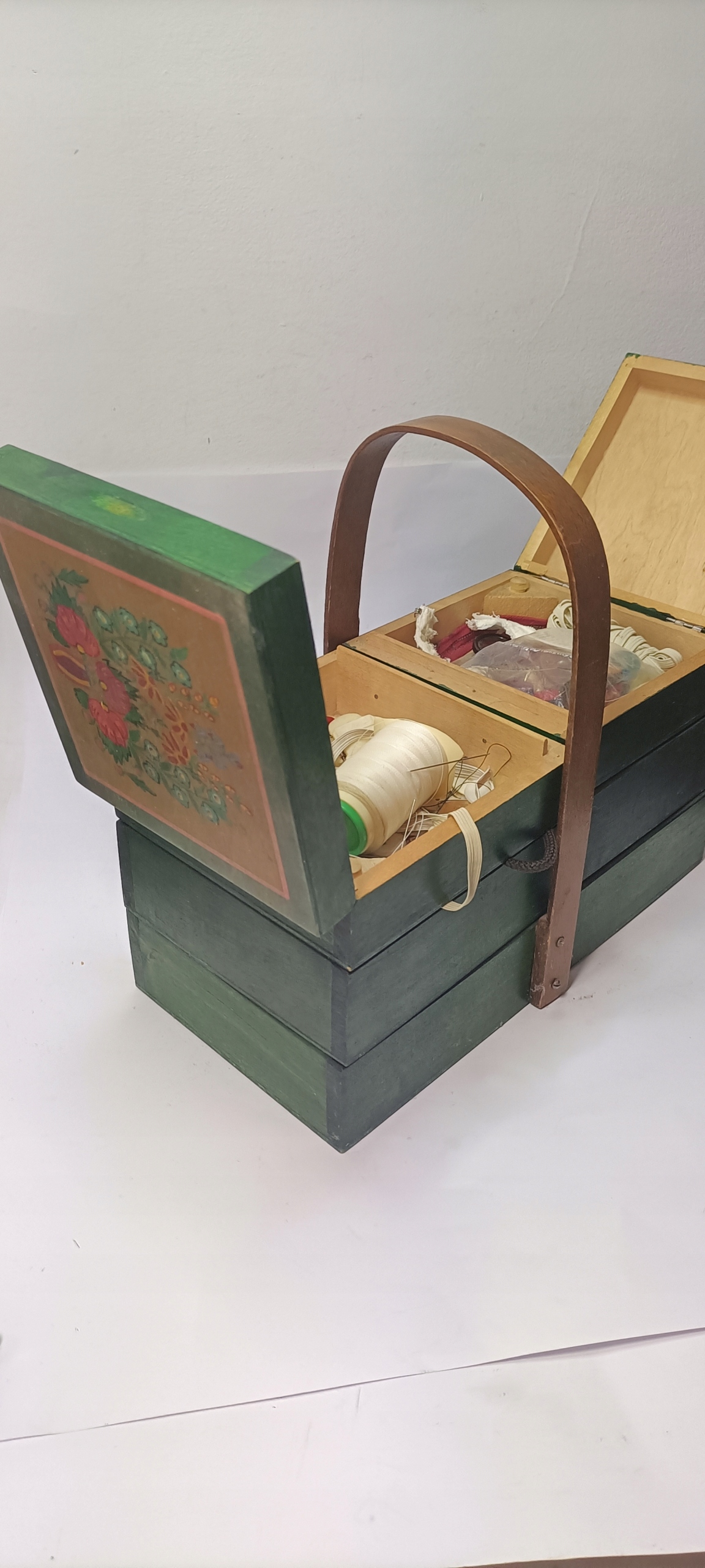 Внутри старые швейные принадлежности: иголки, нитки, пуговицы и т. д.