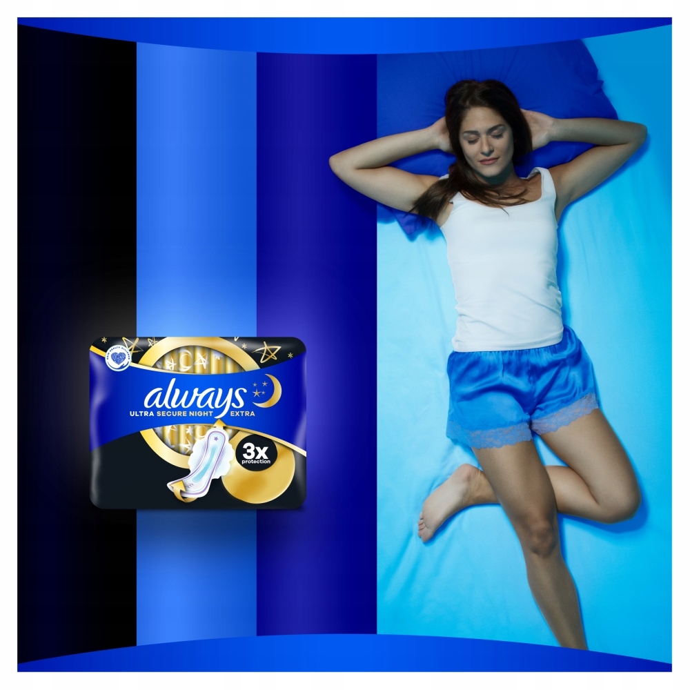 Спокойная ночь гарантирована благодаря гигиеническим прокладкам ALWAYS Ultra Secure Night с крылышками (размер 4). Разработан для тройной защиты, поэтому вам не придется просыпаться, чтобы проверить герметичность и сменить прокладку посреди ночи. Увеличенная на 60 % спинка* в сочетании с технологией LeakGuard удерживает влагу и помогает предотвратить протекание во время ночного кровотечения. Система InstantDry впитывает влагу за считанные секунды и предотвращает ее попадание на кожу. Гигиенические прокладки оснащены технологией OdourLock, которая нейтрализует неприятные запахи, поэтому вы можете чувствовать себя свежим и чистым. Спите спокойно с тройной защитой Always Ultra. Дерматологически одобрено Skin Health Alliance. Попробуйте Always Ultra Secure Night (размер 5), лучшие прокладки Always для защиты в ночное время. Найдите гигиеническую прокладку, которая идеально подойдет вашему телу, с помощью Always My Fit — индивидуальной системы подбора размеров, которая поможет вам найти наилучшую защиту, предлагаемую Always во время менструации, в зависимости от интенсивности менструации и размера нижнего белья, которое вы носите.