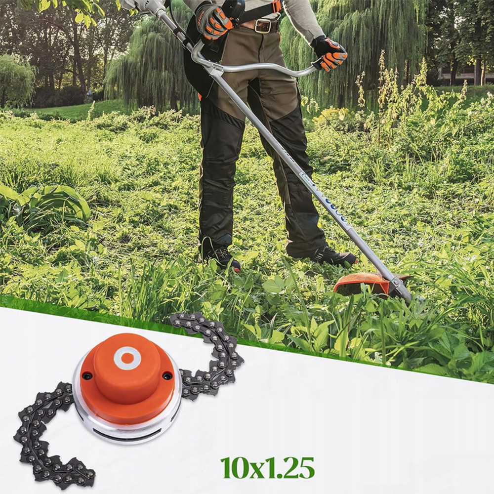 Головка цепного триммера является прямой заменой старых или сломанных головок. Круглое отверстие в центре лезвий для удаления сорняков подходит для широкого спектра бензиновых косилок с валом 10x1,25 и большинства перфораторов с прямым валом.