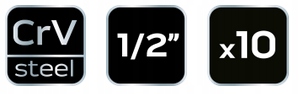 В комплекте торцевая головка 1/2", шестигранная: 10, 12, 13 , 14, 16, 17, 19, 21, 22, 24 мм
