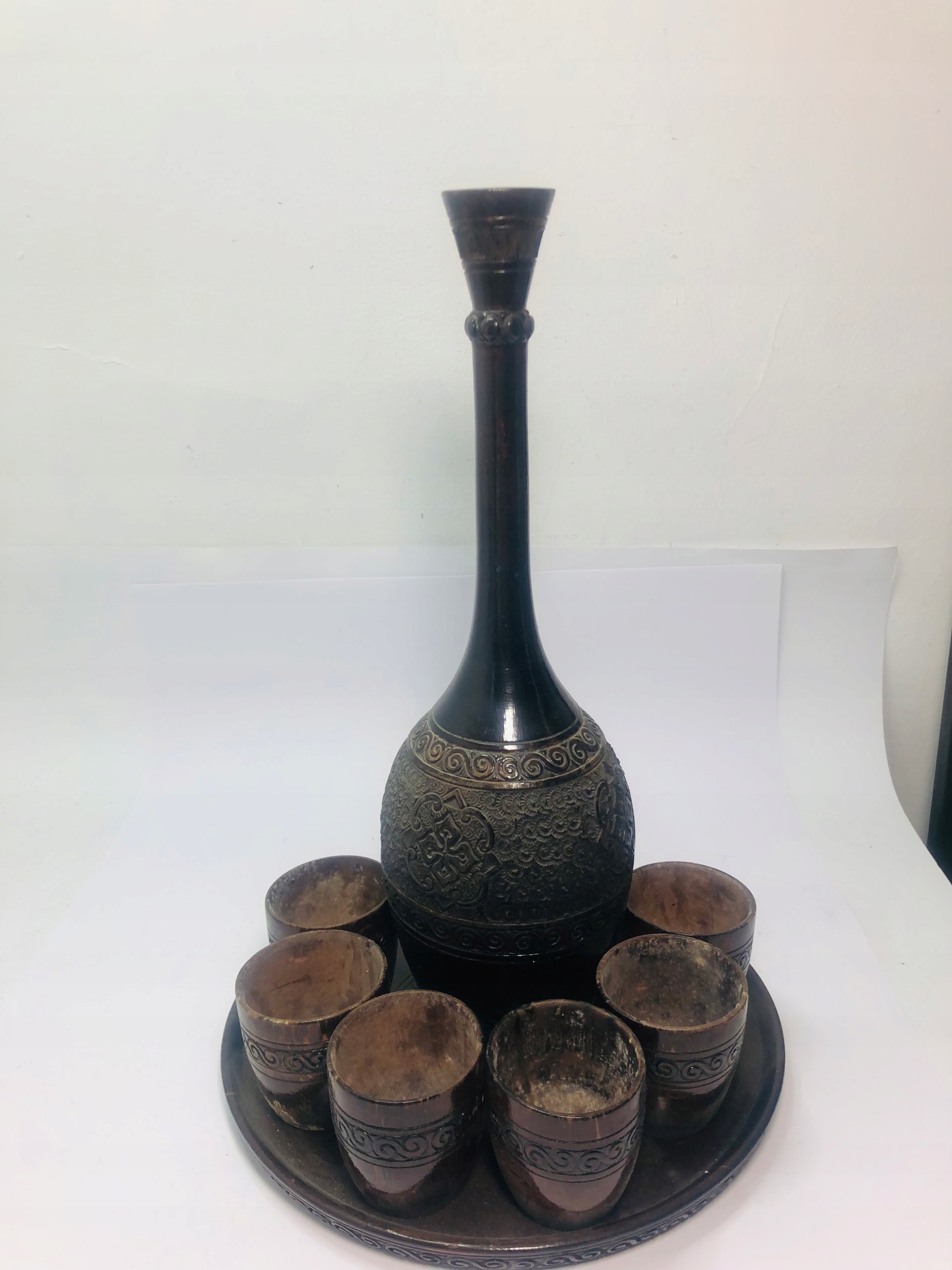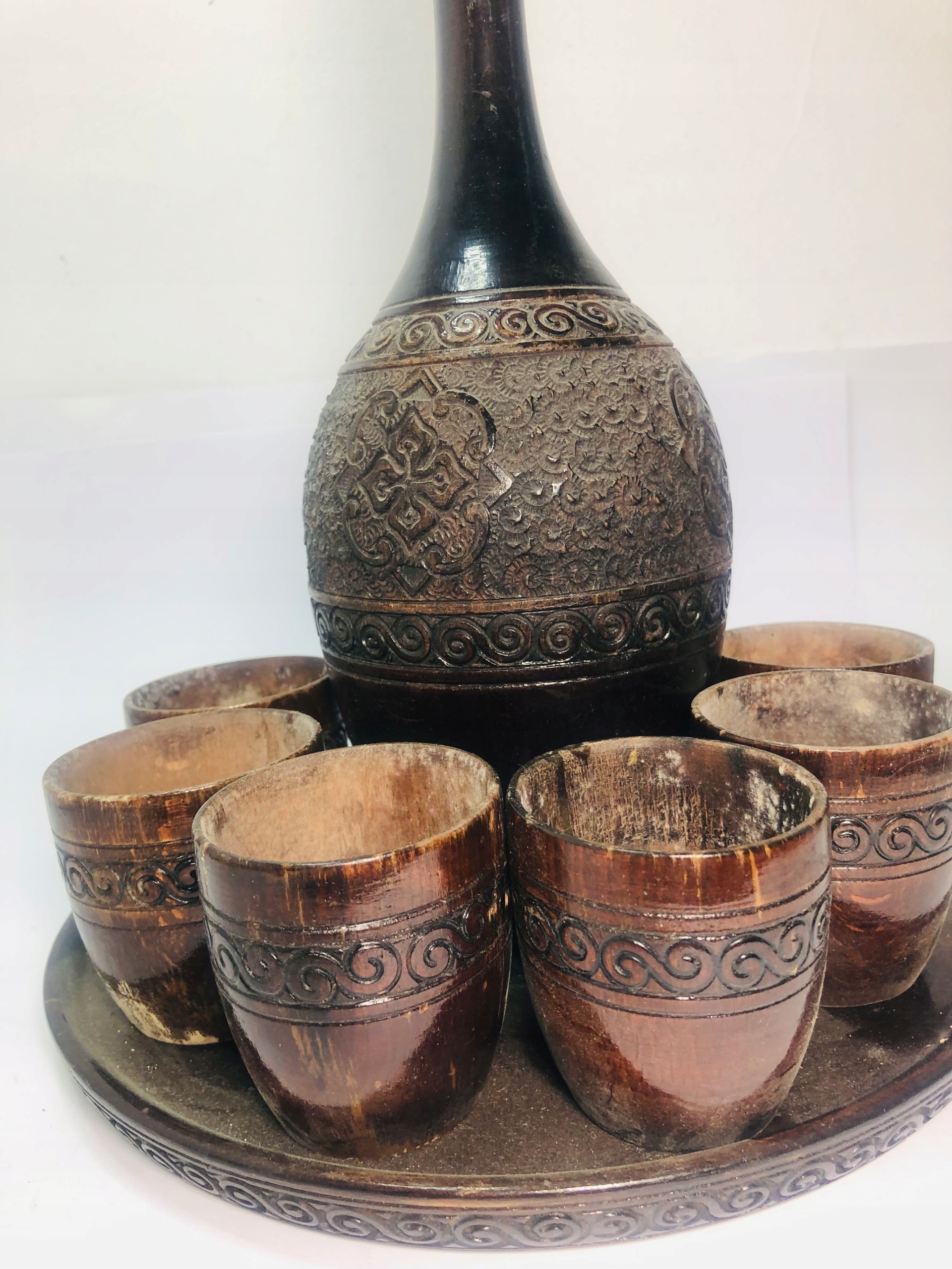 Графин зі склянками на підносі, вінтажний дерев'яний набір