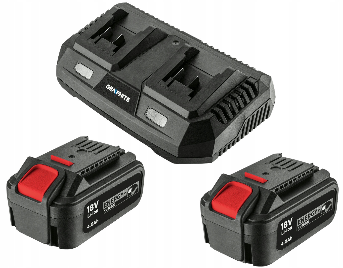Аккумуляторы GRAPHITE ENERGY+ доступны в трех вариантах емкости: 2 Ач, 4 Ач и 6 Ач. Каждый из них оснащен быстрым зарядным устройством, которое полностью зарядит аккумулятор за один час (емкость 2 Ач) или два часа (емкость 4 Ач). Аккумуляторы не имеют эффекта памяти, что означает, что их можно заряжать в любое время, и их не нужно полностью разряжать.
