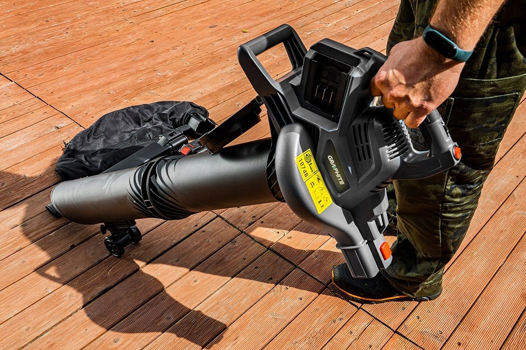 Пылесос-выдуватель листьев GRAPHITE (арт. № 58G036), совместимый с литий-ионными аккумуляторами GRAPHITE Energy+ 18 В, представляет собой практичное и функциональное устройство для поддержания чистоты и избавления от лишних листьев.