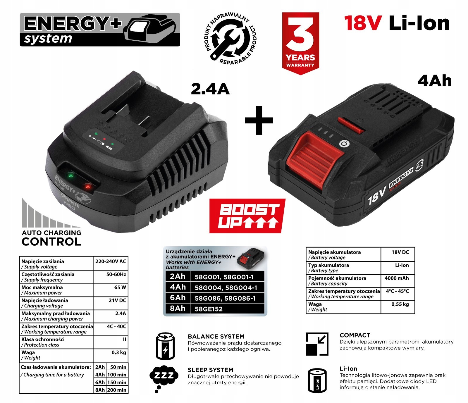 Эффективный набор аккумуляторов с двумя последними батареей 4,0AH в системе энергетической системы+ в системе энергетики+. Зарядное устройство Battery и Boostup, введенное в предложение о графите во втором квартале 2025 года, в качестве набора 58GE132-1 является частью этого набора.