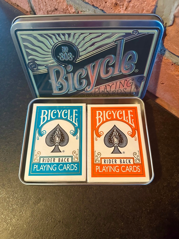Выберите две из четырех видимых колод в эксклюзивном металлическом футляре Bicycle!Bicycle Rider Back — самые популярные и часто выбираемые карты в мире.