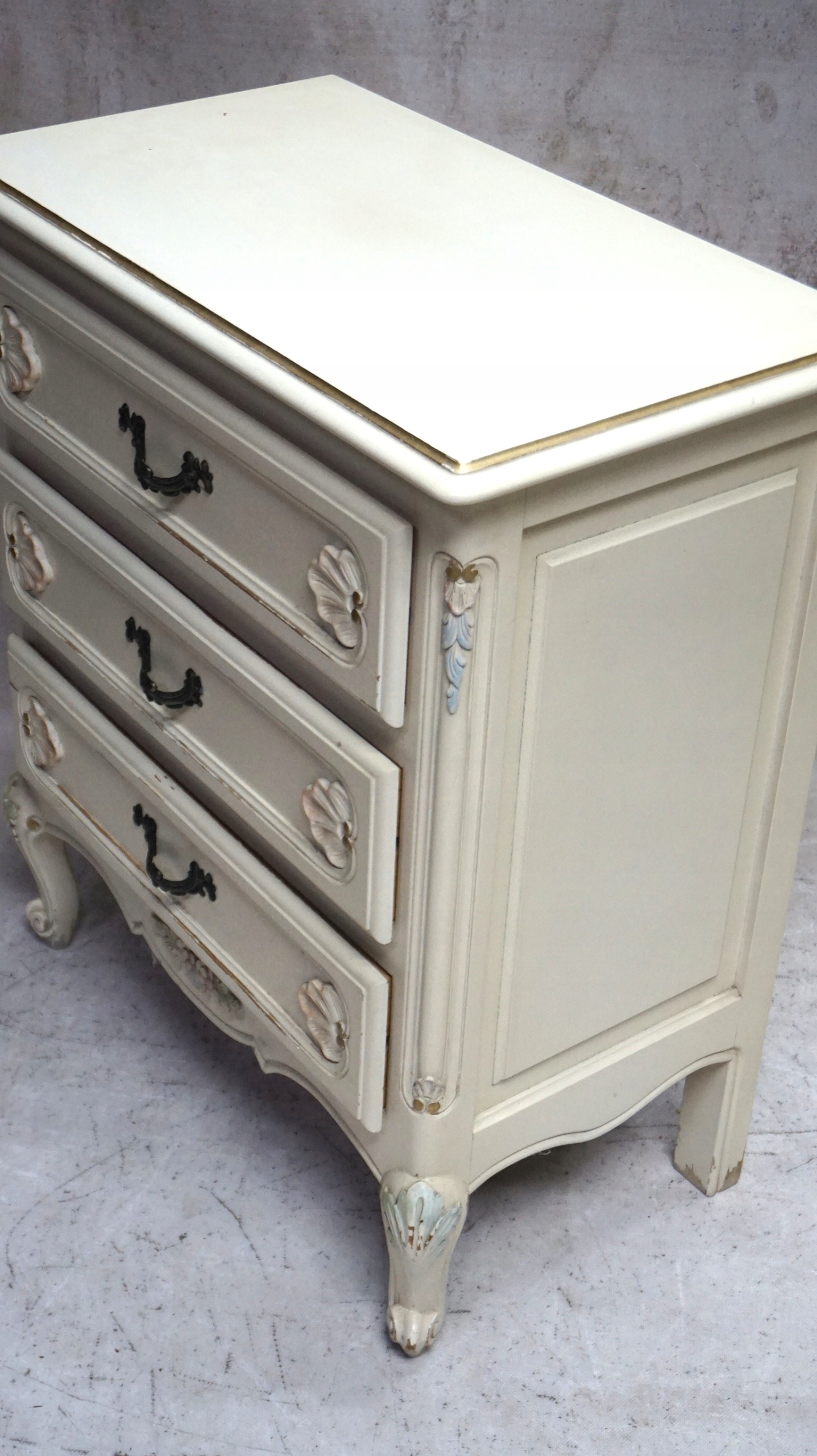 Живопись, нарисованная пастельными цветами. Три ящика, на согнутых ногах.