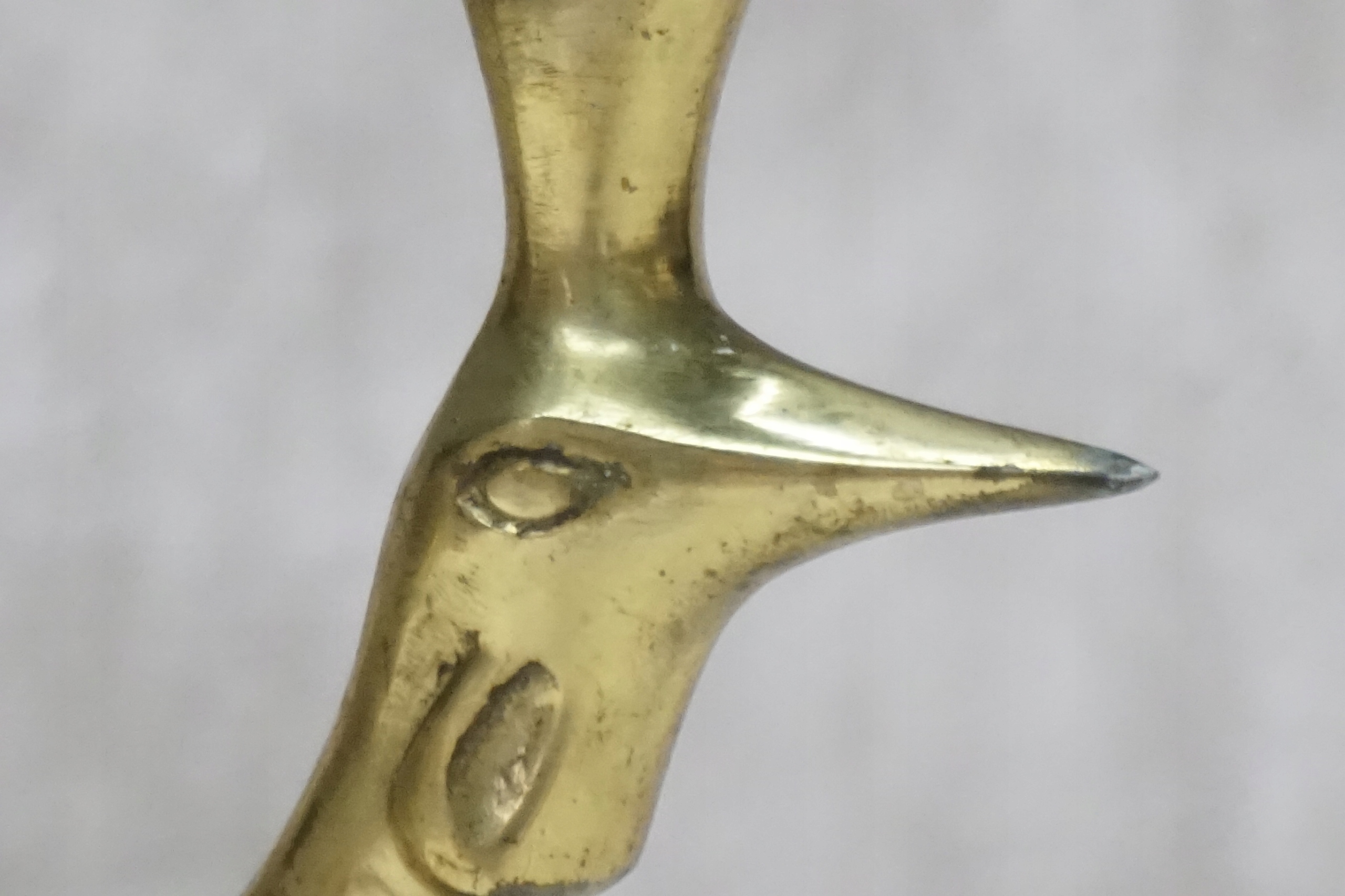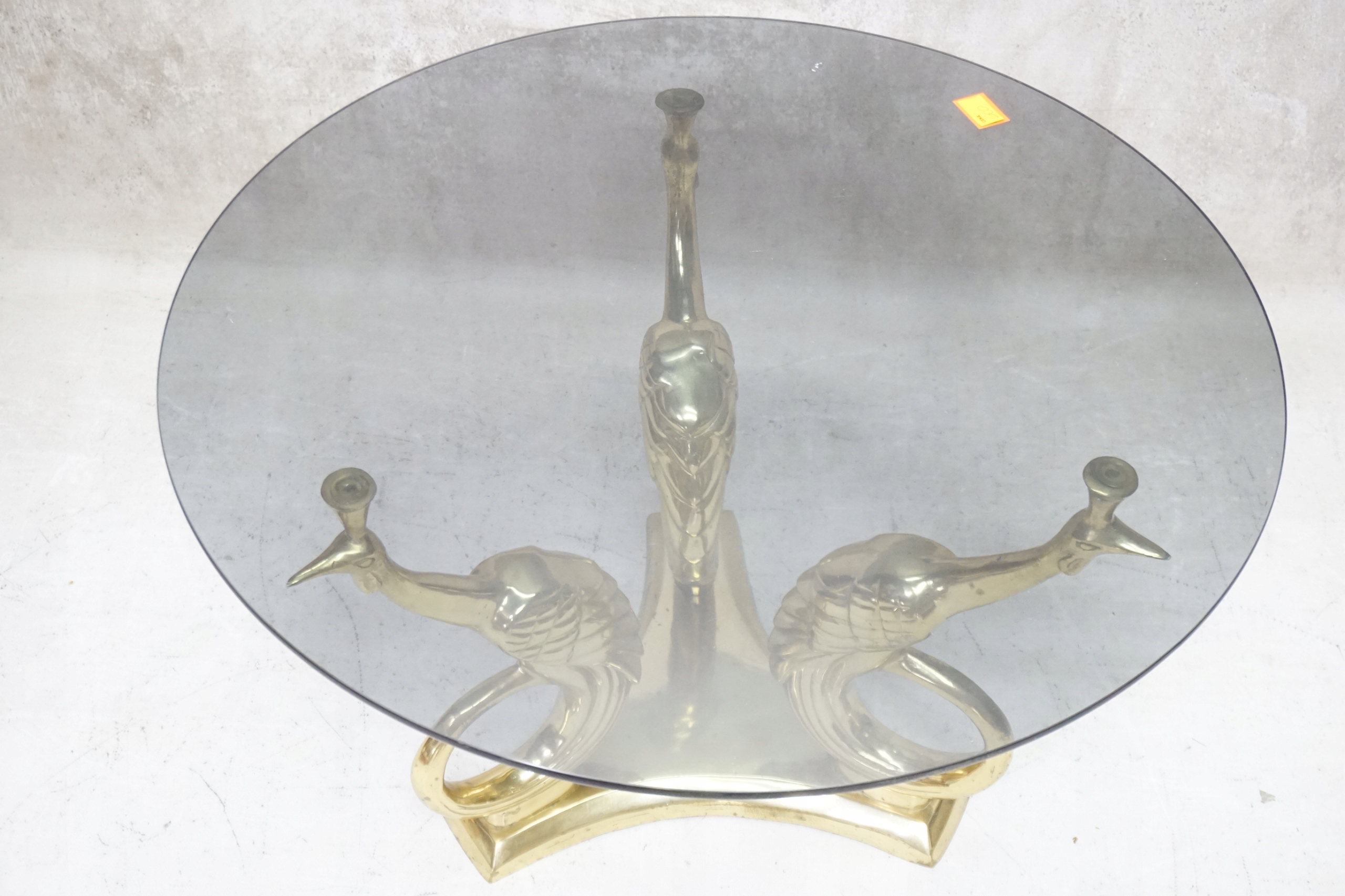 Латунное основание показывает три павлина с свернутыми хвостами.