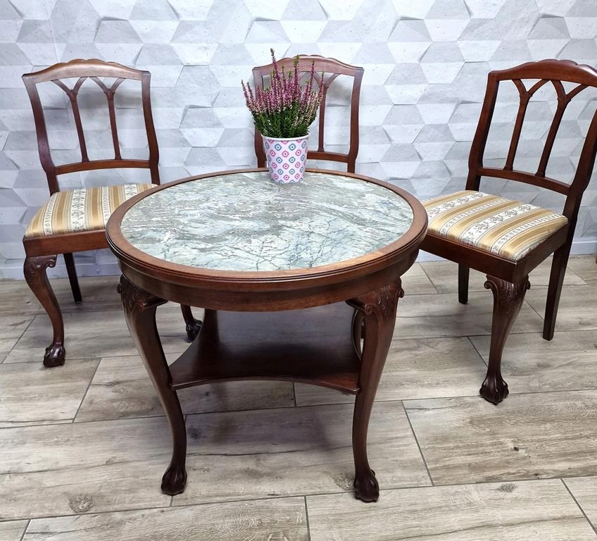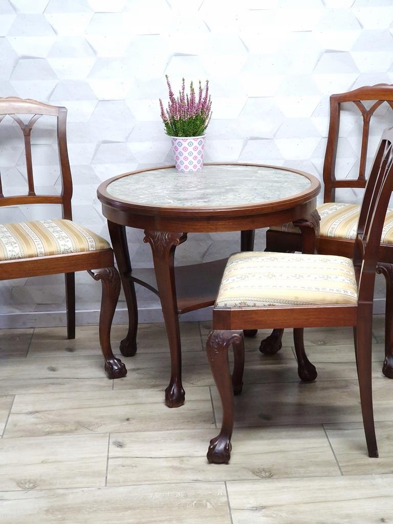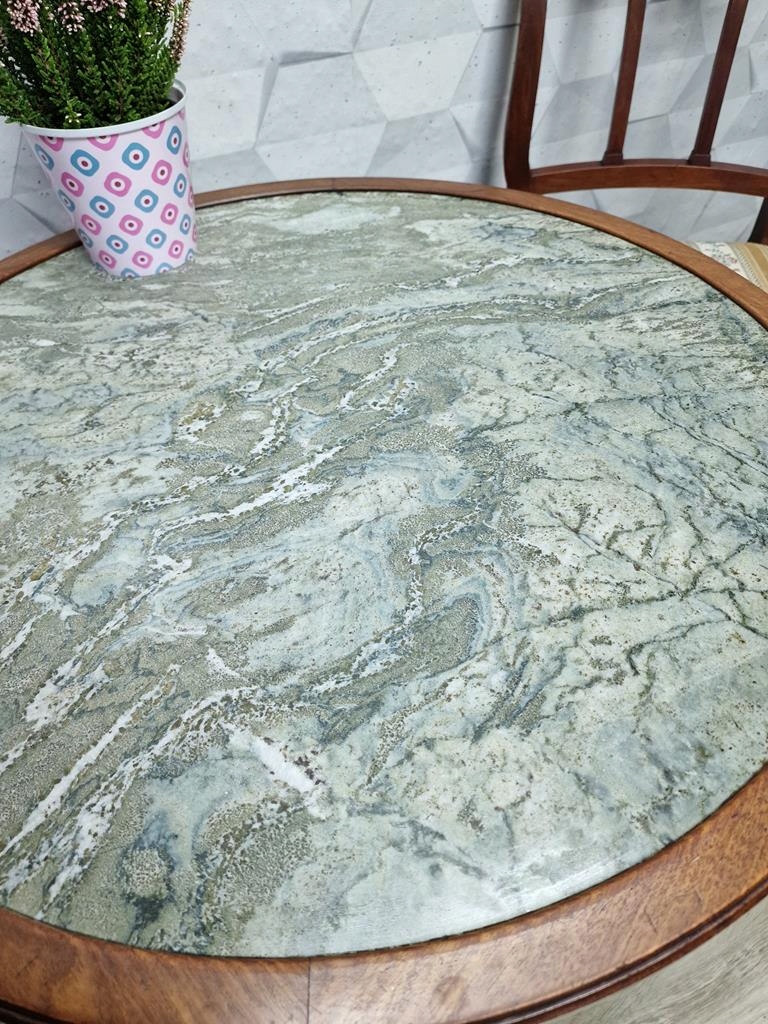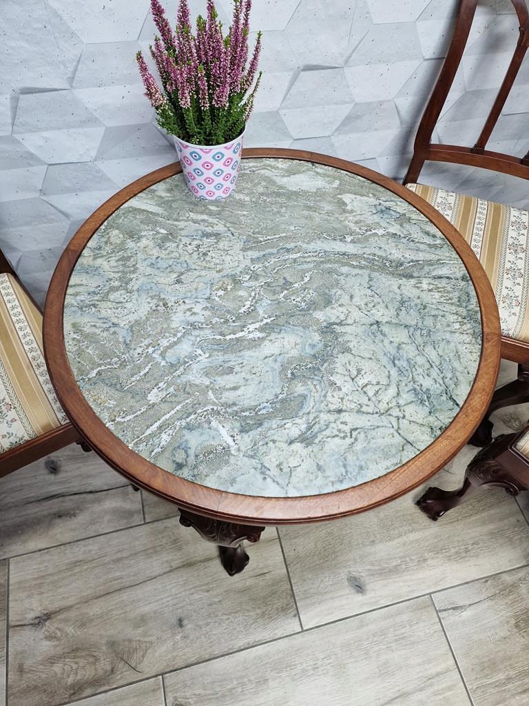 Круглый стол со столешницей из серого мрамора.