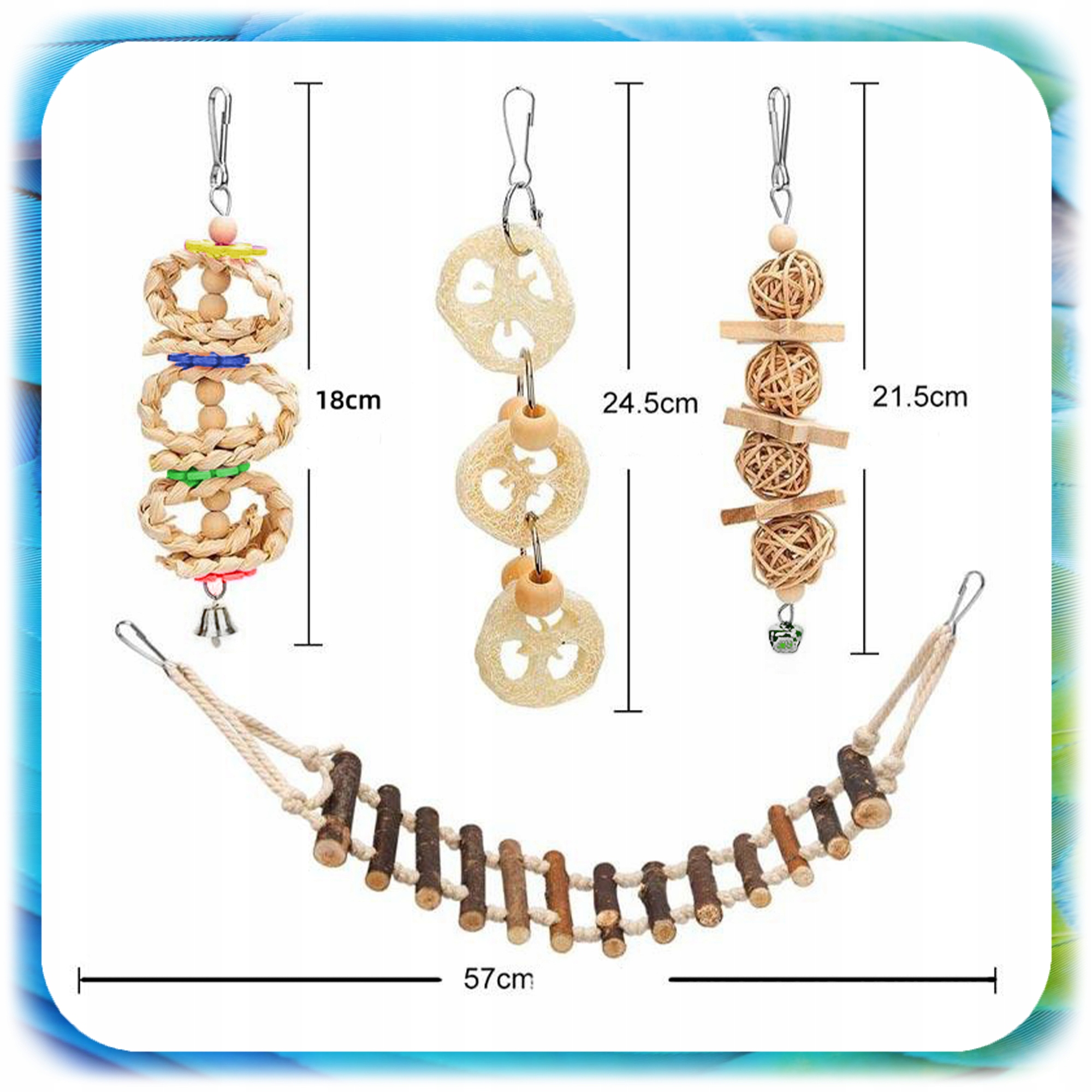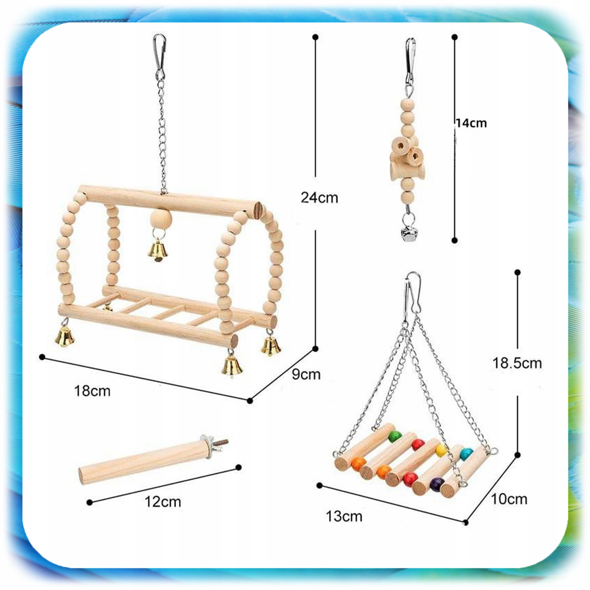 Красочные деревянные элементы в естественных оттенках и яркие акценты колокольчиков делают набор не только идеально подходит для клетки b>, но также дает ему уникальный характер. Это прекрасное украшение, которое одновременно выполняет свою образовательную и развлекательную функцию!
