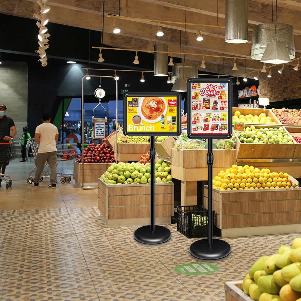 ✔ регулируемый угол наклона и идеальная высота. Информационная подставка может быть повернута на 360 градусов, устанавливая его под любым углом, как по горизонтали, так и по вертикали. Высота может быть отрегулирована в диапазоне от 75 см до 125 см. В задней части подставки есть гайка бабочки, которая позволяет вам регулировать без использования инструментов, благодаря которой угол наклона может быть легко адаптирован к потребностям экспозиции под разными углами.