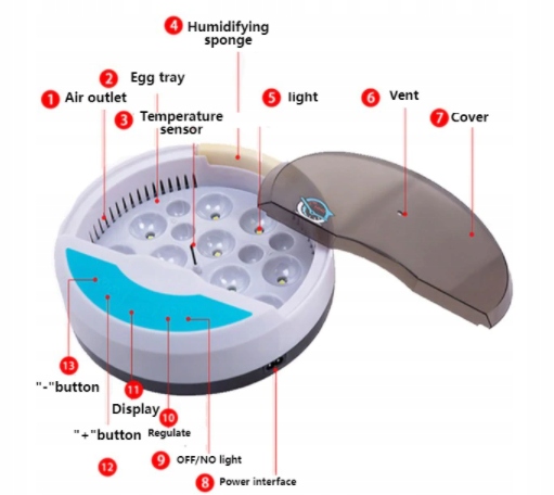 Когда влажность или температура упадут, раздастся звуковой сигнал, напоминающий о необходимости добавить воды. Требуется переворачивать яйца самостоятельно - инкубатор их не переворачивает.