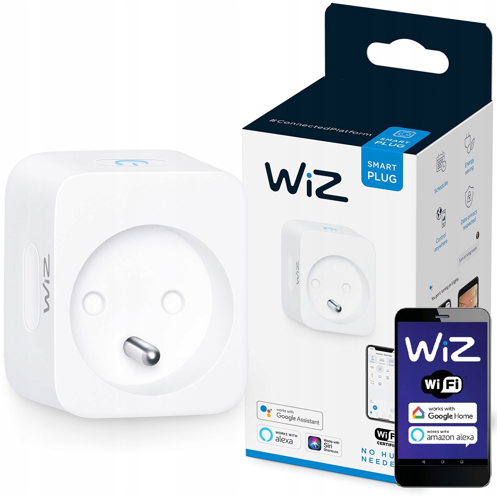 Интеллектуальная розетка WiZ Smart Plug типа E позволяет управлять устройствами благодаря мобильному приложению WiZ Connected от в любом месте, где есть доступ в Интернет. Плагин совместим с популярными голосовыми помощниками: Google Assistant, Amazon Alexa. Розетка позволяет удаленно управлять освещением и приборами, адаптируя их к ритму дня, что повышает безопасность и экономит электроэнергию.