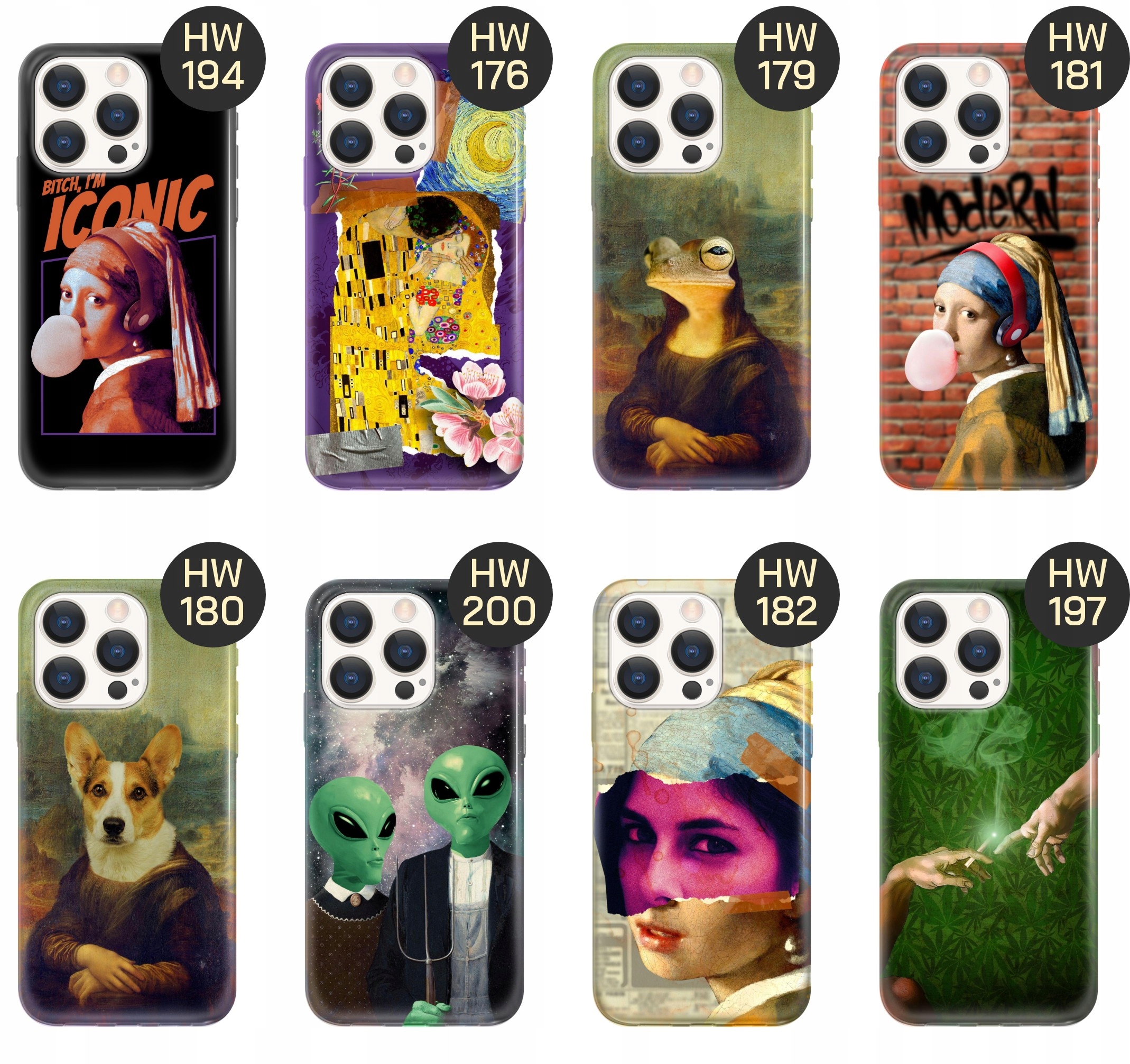 Современная коллекция - это совершенно современный подход к классическим произведениям искусства - смешной, полной иронии и пародии. Деконструкция популярных картин и их коллажа в некотором смысле, что они могут вытащить их из пафоса и некоторой искусственности. Смотрите наш набор, выберите Graphics, и мы распечатаем ее в вашем телефоне.