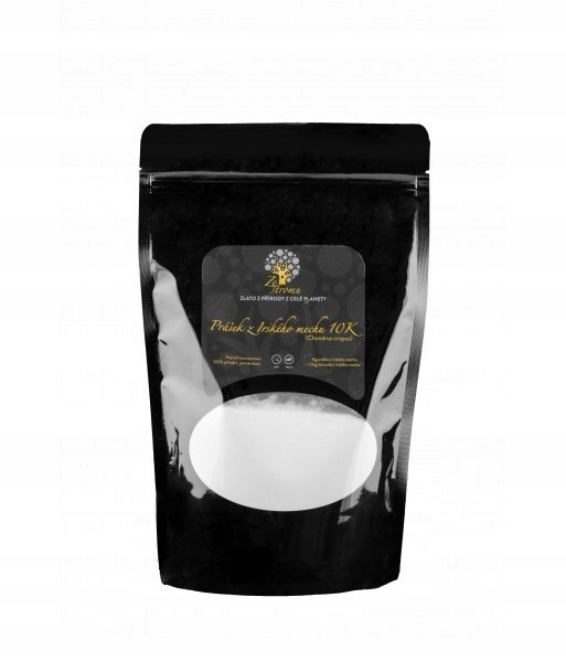 Ирландский мх чрезвычайно концентрирован, 1 кг порошкообразного ирландского моха соответствует 10 кг свежего мха. Он мелко измельчен, дикий, сбрал ручной, промытый и сушеный на солнце при низкой температуре. Это продукт высочайшего качества, без добавок и консервантов. Его можно использовать в качестве пищевой добавки, но также в качестве натуральной косметики по уходу за кожей и волосами.
