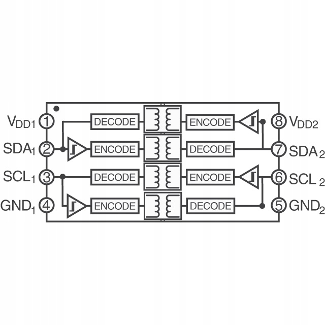 ADUM1250ARZ — это цифровой изолятор с возможностью «горячей» замены. Он имеет нефиксируемые двусторонние каналы связи, совместимые с интерфейсами I²C