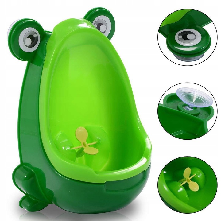 Мини-писсуар в виде лягушки для мальчика. Форма лягушки, цвета и вращающийся вентилятор помогут научиться самостоятельности. Имеет съемную вставку со специальной ручкой, благодаря которой опорожнять и мыть писсуар можно легко и удобно.
