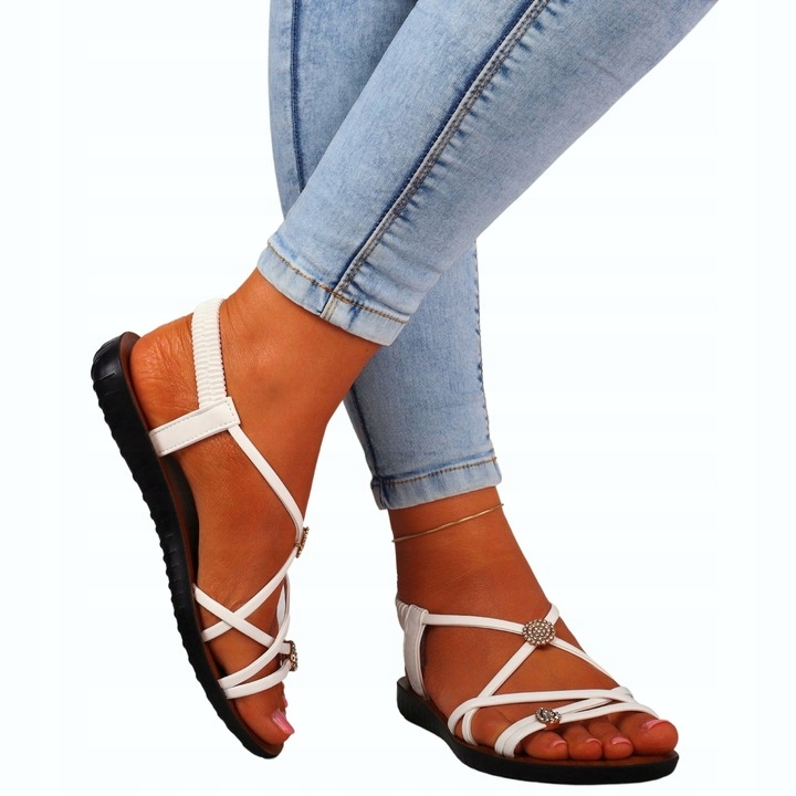 Женские белые сандалии на плоском дне. Идеально идеально подходит для обуви каждый день летом, жаркие дни. Simple Cut также адаптируется к элегантным стилизациям, а декоративные бусы добавят очарование любой стилизации. Эластичный ремешок на пятке облегчает посадку на обувь и облегчает посадку к ноге.