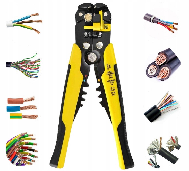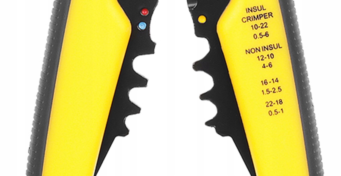 - ТЕХНИЧЕСКИЕ ХАРАКТЕРИСТИКИ - цвет: желтый и черный; материал: хромованадиевая сталь/ПП/ТПР; противоскользящая накладка: ДА; механизм: передний, автоматический; зачистка изоляции кабеля диаметром: 0,2 – 6 мм² (10 – 24 AWG); обжим изолированных клемм разъема: 0,5–6 мм² (22–10 AWG) и неизолированных: 4–6 мм² (12–10 AWG), 1,5–2,5 мм² (16–14 AWG), 05 – 1 мм² (22–18 AWG); размеры (длина/ширина/высота): 20/10/3 см; вес: 0,35 кг; вес в упаковке: 0,4 кг.