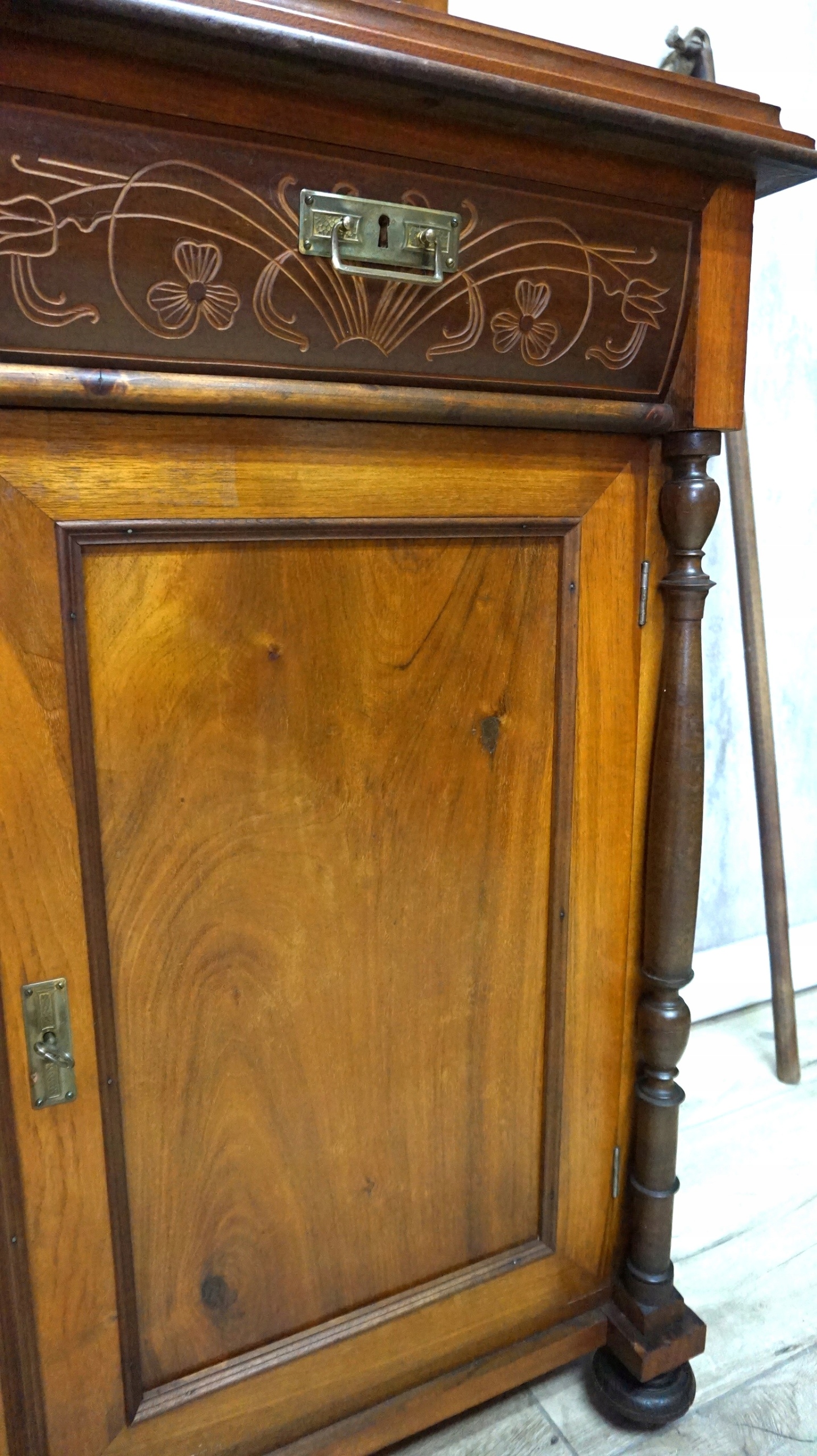 Комод с красивыми резными элементами на ящиках и на венце