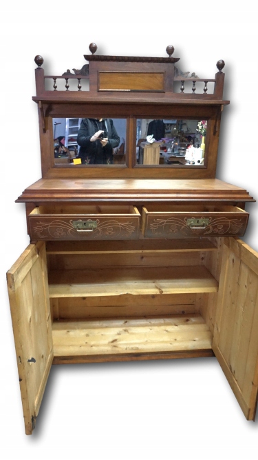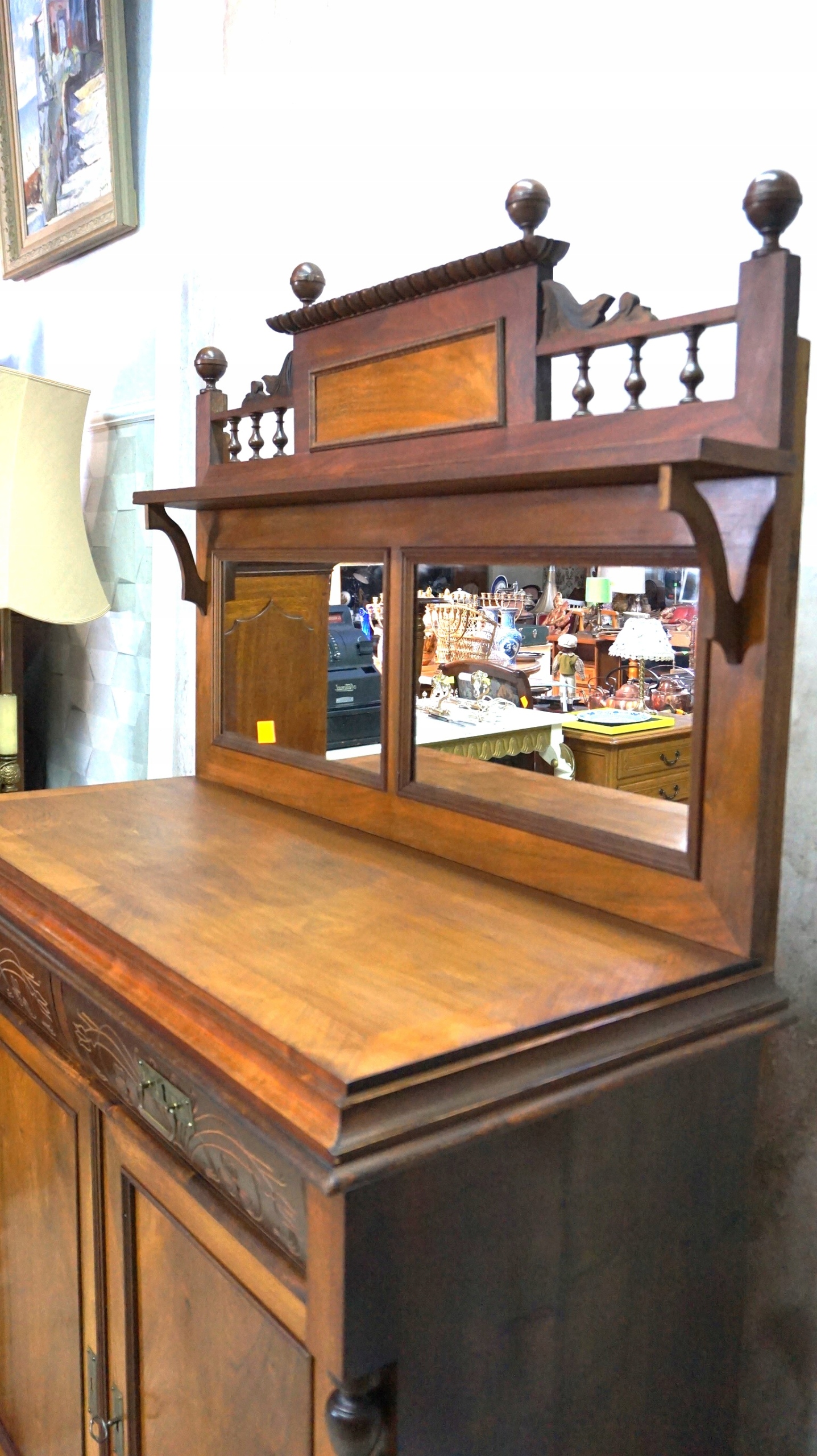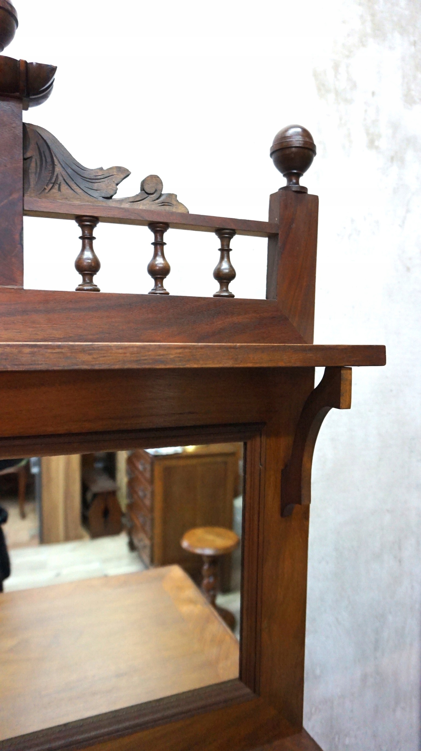 Над комодом, в деревянной декорированной раме с балясинами, расположены два зеркала.