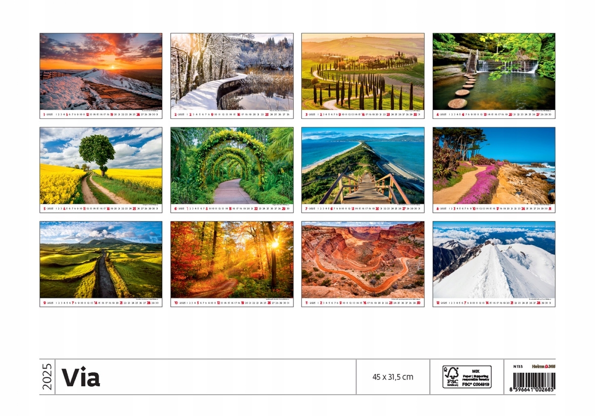 Многоплановый настенный календарь VIA от издательства Helma 365 Календарь с красивыми фотографиями, изданный в большом формате на элегантной мелованной бумаге. Via 2025 — это коллекция необыкновенных вдохновляющих фотографий, основной темой которых является дорога — извилистая и узкая, петляющая по склону горы, ухабистая и живописная дорога среди полей, дорога, теряющая свой конец среди морских волн. Потрясающие виды осветят любой интерьер – они послужат украшением, а также натолкнут на размышления и поднимут хорошее настроение. Тема путешествия в неизведанное будет мотивировать вас действовать и работать над достижением цели. А после напряженного дня фотографии помогут расслабиться и перенести мысли к потрясающе красивым пейзажам. Календарь Via станет прекрасным подарком на 2025 год. После конца 2025 года фотографии из календаря можно будет использовать в качестве феноменальных постеров.