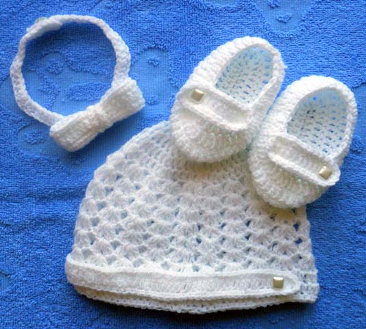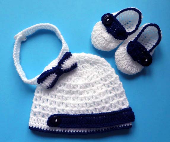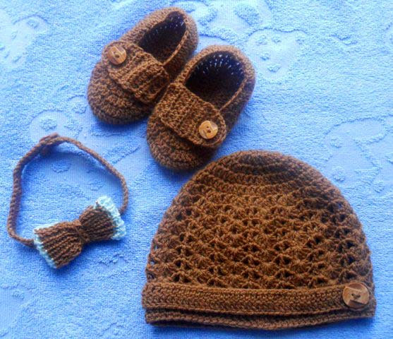 Комплект для вязания крючком из 3 предметов: шапка + туфли + банка галстука-бабочки. может быть выполнено в любом цвете пряжи и фурнитуры.