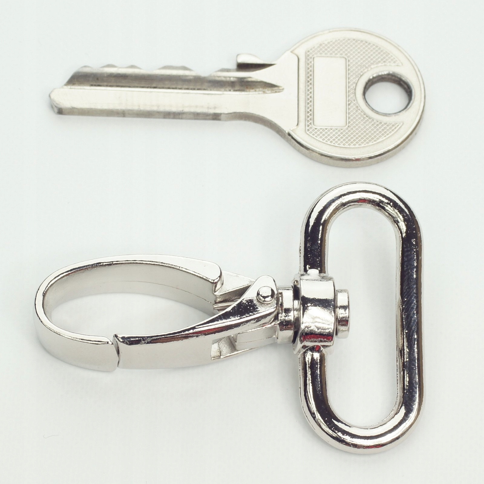 Карабин с рычагом и внутренней пружиной, соединенный с возможностью вращения в овал. Длина набора составляет около 56 мм. Зазор проушины составляет около 32 мм. Изделие изготовлено из никелированного металла серебристого цвета.