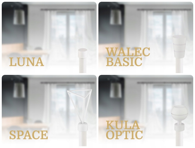 Серия белых карнизов состоит из карнизов сечением 19 миллиметров, настенных кронштейнов и нескольких декоративных наконечников. Среди них концовка Луна — минималистичная концовка в форме кепки. Плюсом такого решения является уверенность в том, что карниз никогда не выйдет из моды и будет служить своему назначению, даже если мы решим сменить декор. Еще один вариант — Валик с двумя маленькими резаками. Для тех, кто предпочитает классические решения, мы предлагаем окончаниеKula Optic. Наиболее популярным среди наших клиентов является окончание в виде геометрической пространственной фигуры - Космос.