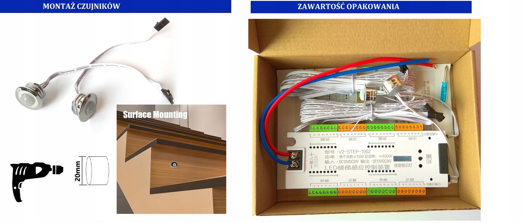 Контроллер оснащен 2 PIR-датчиками на кабелях, которые размещены внизу и вверху лестницы. Когда один из датчиков фиксирует движение (идем вверх или вниз), освещение включается последовательно от первой ступени к последней или наоборот, в зависимости от того, какой датчик фиксирует движение.
