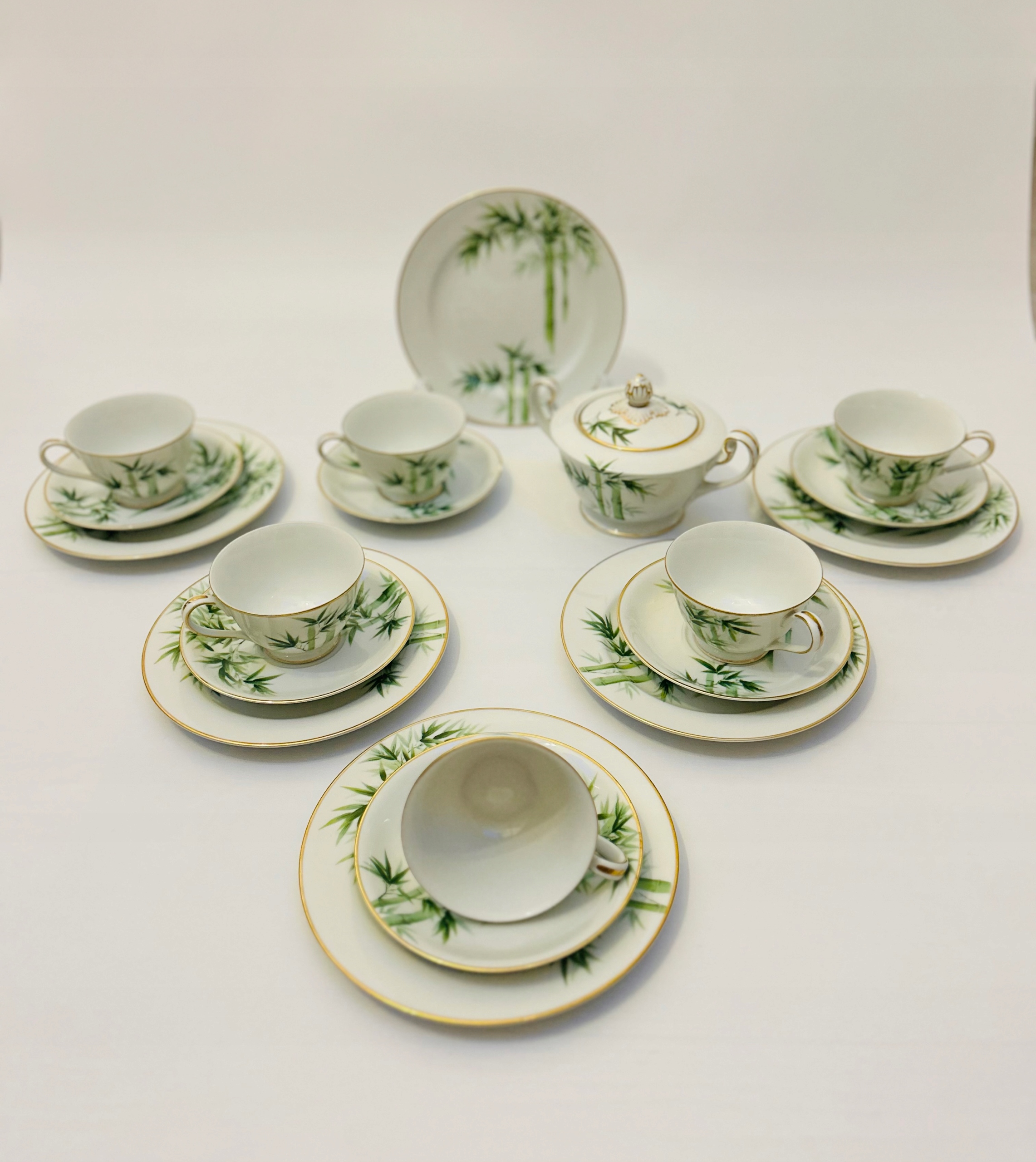 >Светло-зеленые стебли бамбука украшают посуду, а золотая отделка по краям придает элегантности.