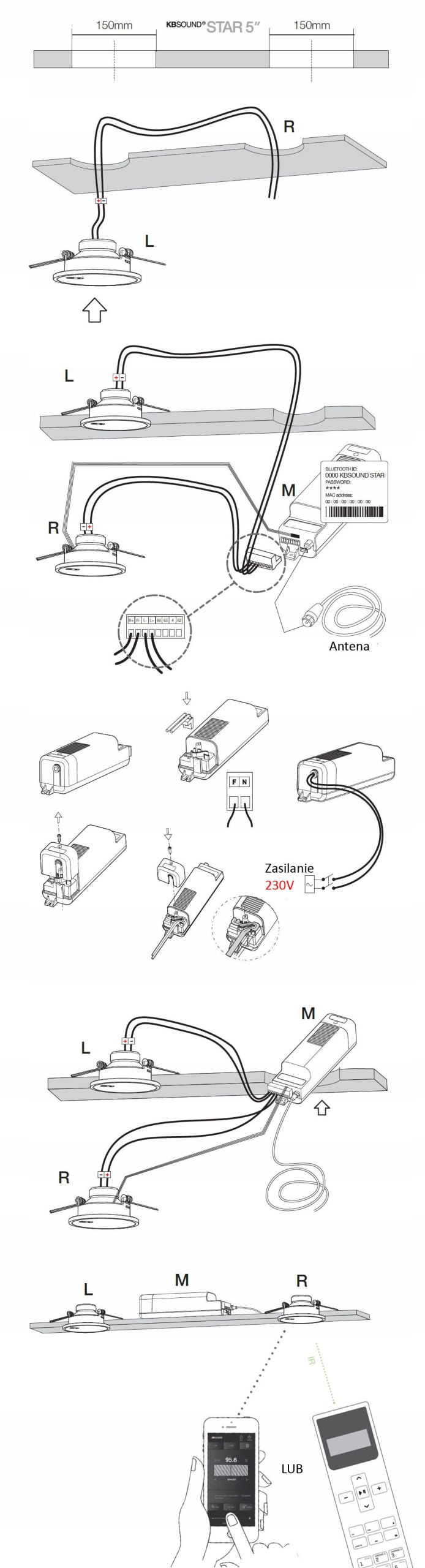 Просто просверлите в потолке два отверстия диаметром 150 мм для динамиков (Л и П). ). Установите блок управления M через отверстие громкоговорителя R. Старайтесь расположить антенный кабель вдали от потенциальных источников помех, таких как люминесцентные лампы, источники питания, галогенные лампы, вентиляторы, двигатели и т. д., которые могут помешать приему радиостанций и влияют на качество звука. После размещения центрального блока остается только подключить динамик и кабели питания. Последний этап – размещение динамиков в заранее просверленные отверстия.Расстояние между модулем питания М и внешним устройством, оснащенным Bluetooth, не должно превышать 10м. Также рекомендуется, чтобы глубина, необходимая для установки модуля FM M, составляла примерно 95 мм.