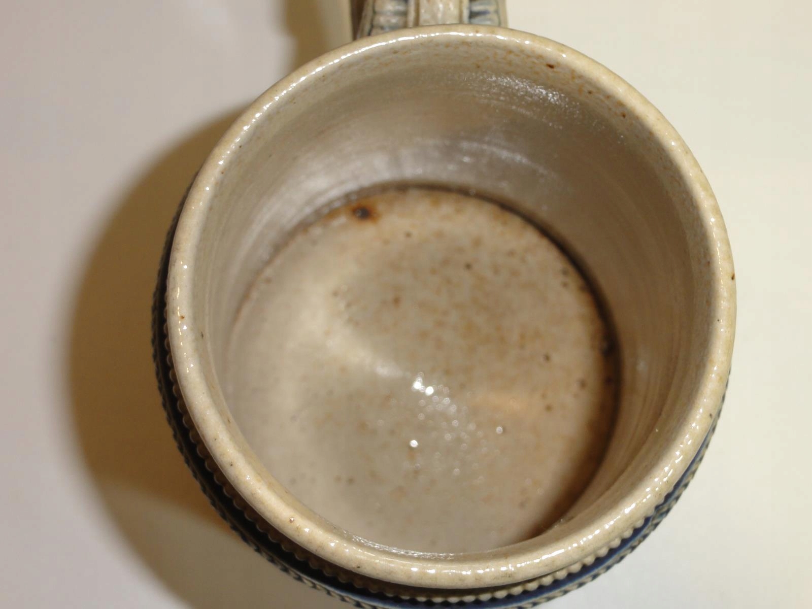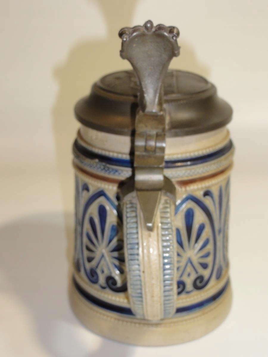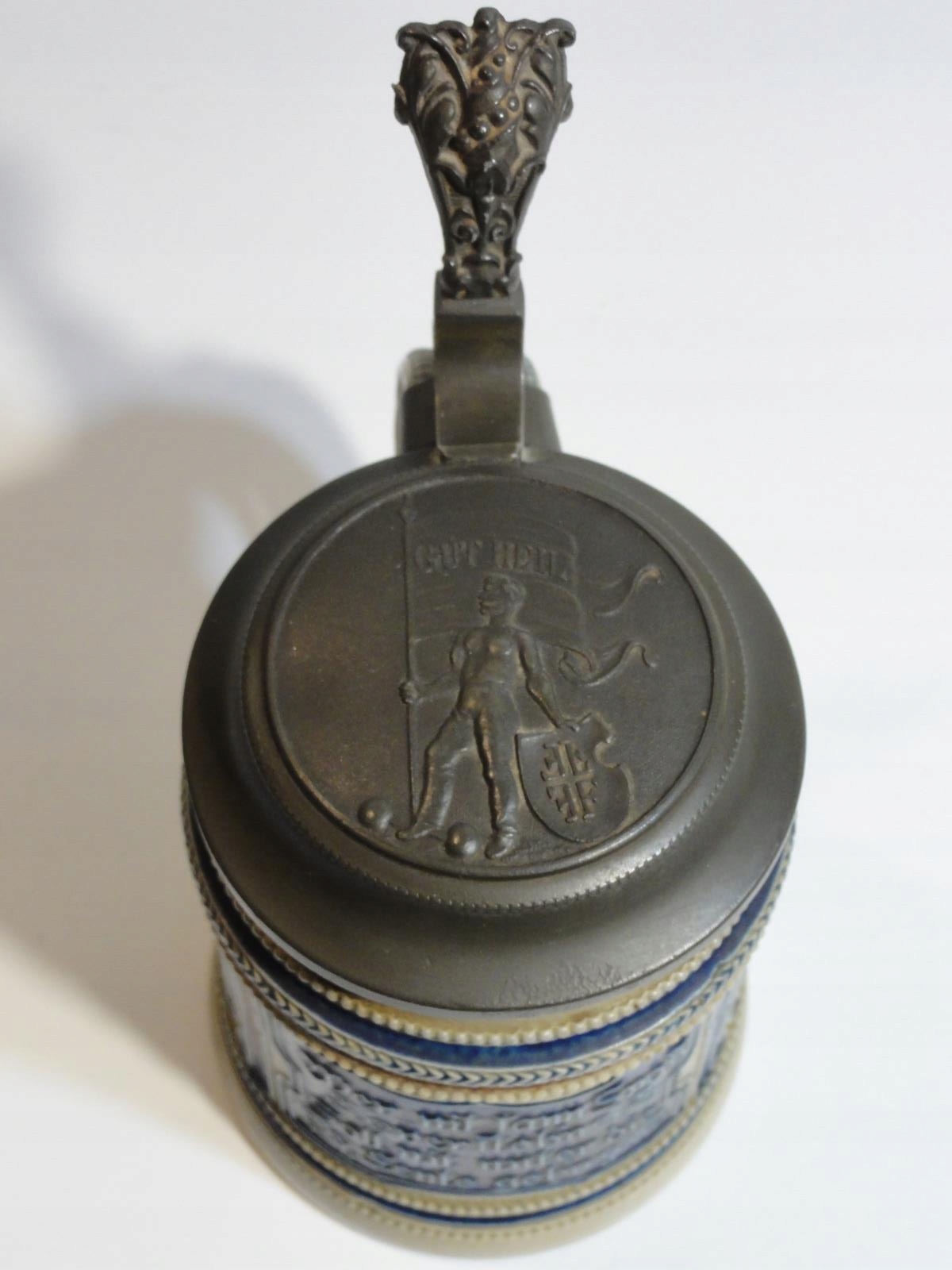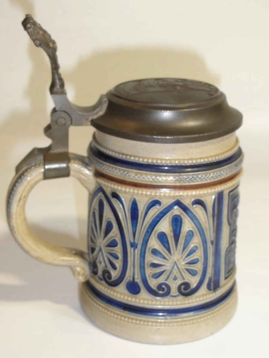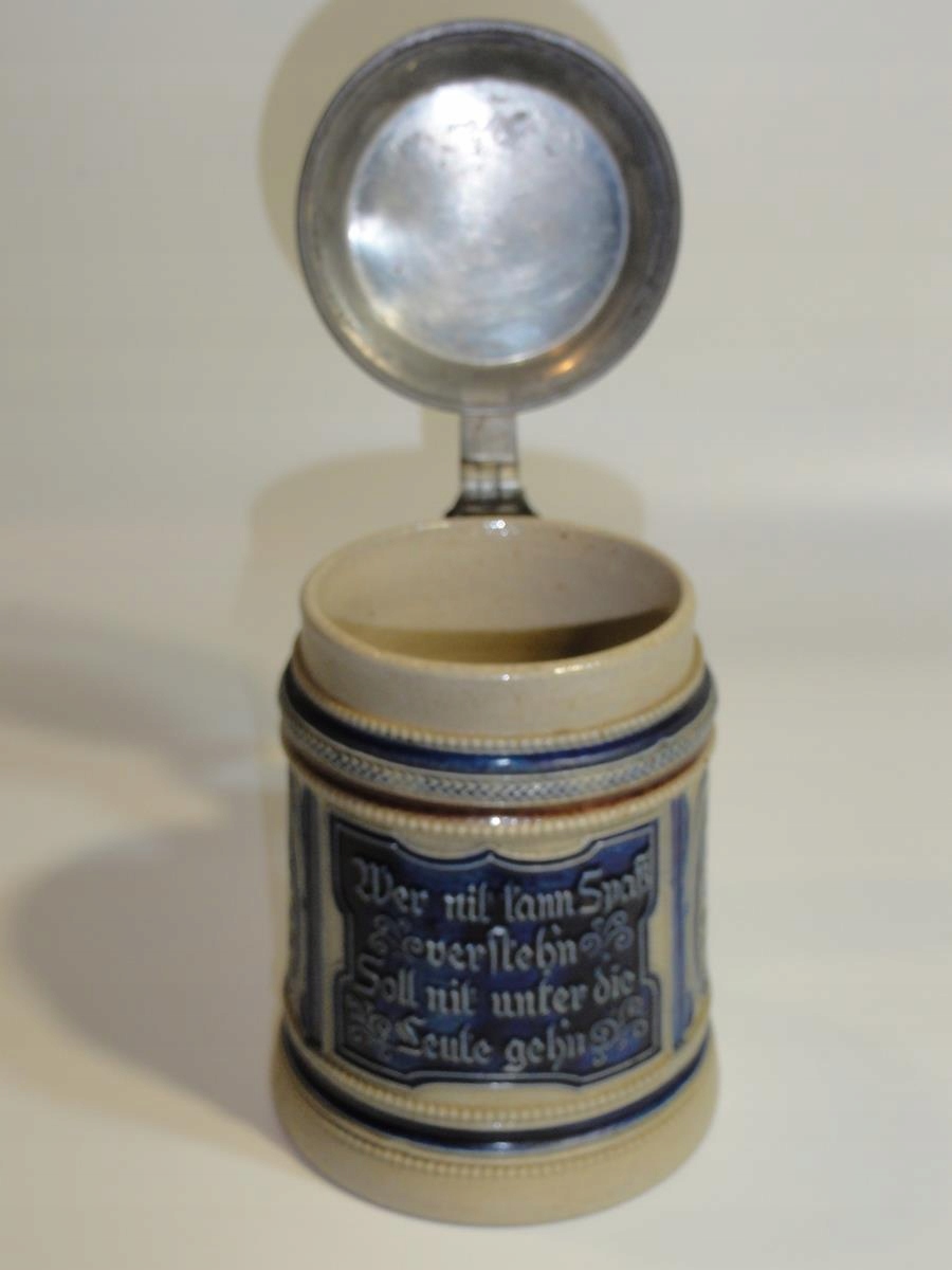 *керамическая кружка, расписанная кобальтом, с декоративной жестяной крышкой,