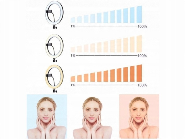 Лампа Можно управлять с помощью пульта дистанционного управления, расположенного на кабеле. Три режима освещения: холодный, теплый и нейтральный. Простая установка на устойчивый штатив обеспечивает исключительно комфортную работу со светильником. Входящий в комплект держатель телефона обеспечит прочное и безопасное крепление камеры. Форма круга означает, что фотографируемый объект освещается равномерно со всех сторон и нет необходимости предусматривать другие источники света.
