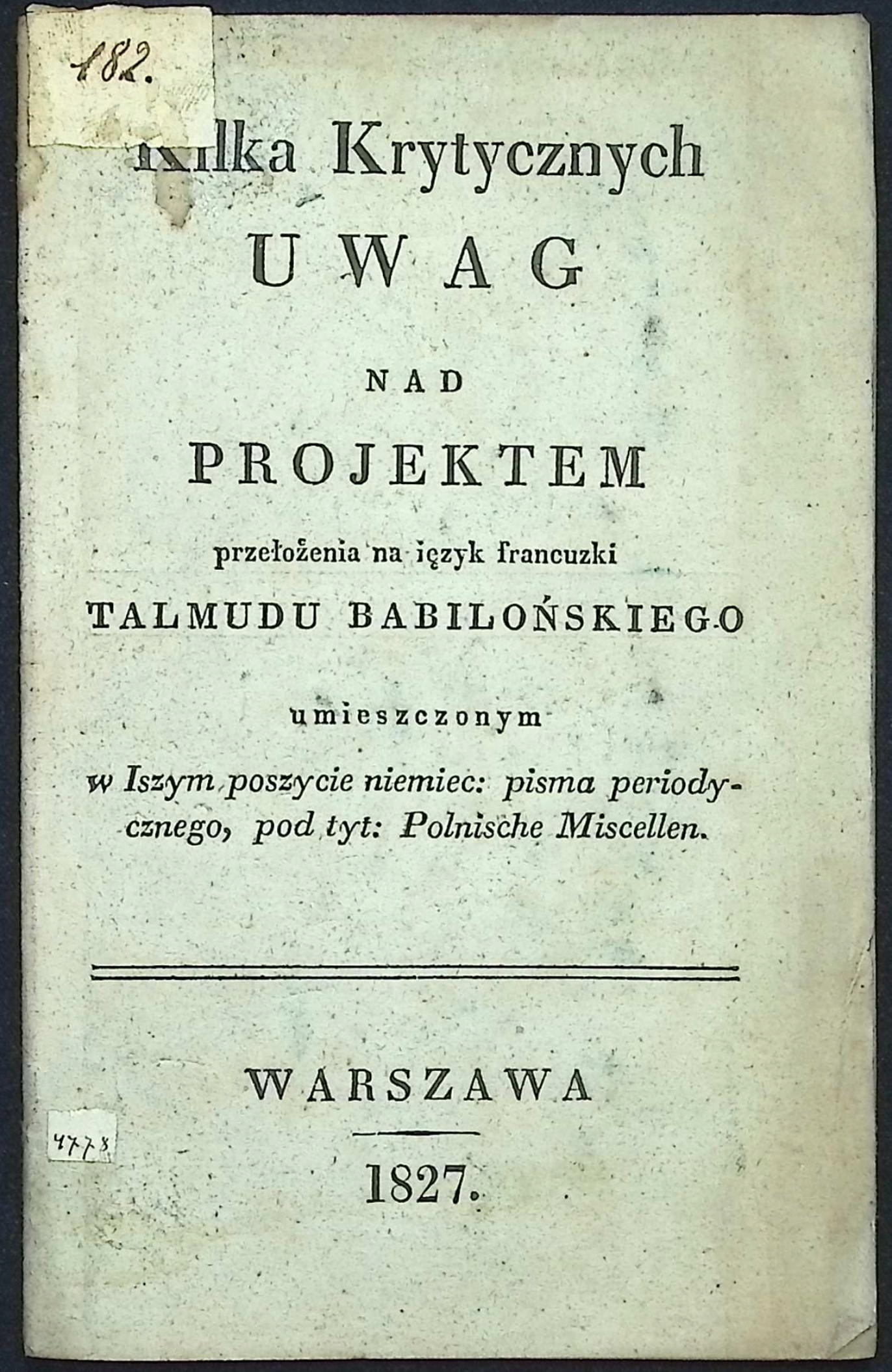 Kilka krytycznych uwag nad projektem przełożenia Talmudu Babilońskiego 1827