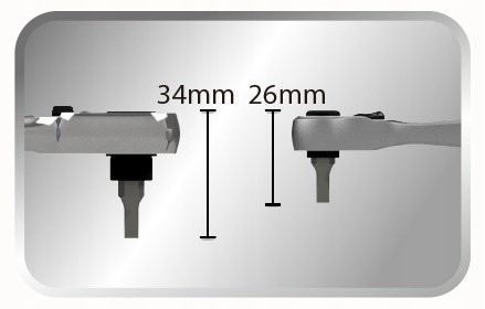 Храповик изготовлен из хромованадиевой Cr-V стали, а элементы храпового механизма внутри ручки изготовлены из хромомолибденовой Cr-Mo стали. Трещотка имеет металлическую ручку, переключатель вправо/влево и кнопку фиксации насадки, полированную и хромированную поверхность. Дополнительными преимуществами трещотки являются ее небольшой размер, что облегчает работу в труднодоступных местах, а также 12-гранное гнездо для бит, что упрощает их замену.