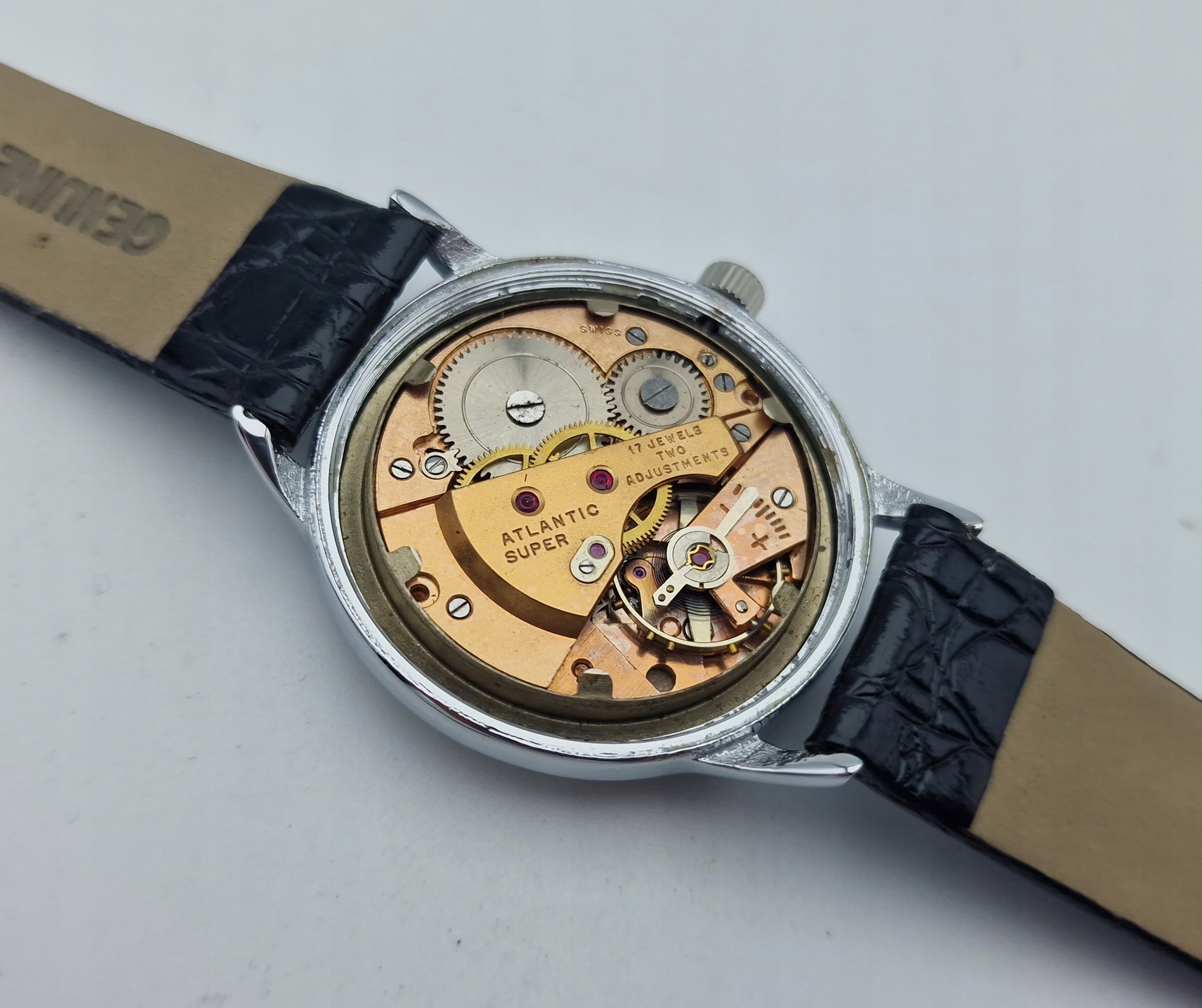 - Позолоченный механизм часов с 17 камнями, со швейцарским анкерным спусковым механизмом. На механизме выбиты следующие подписи: «АТЛАНТИК СУПЕР, ДВЕ РЕГУЛИРОВКИ, 17 ДРАГОЦЕНИЙ, ШВЕЙЦАРИЯ». Механизм находится в хорошем и точном рабочем состоянии, после осмотра и обслуживания часовщиком и в отличном состоянии.