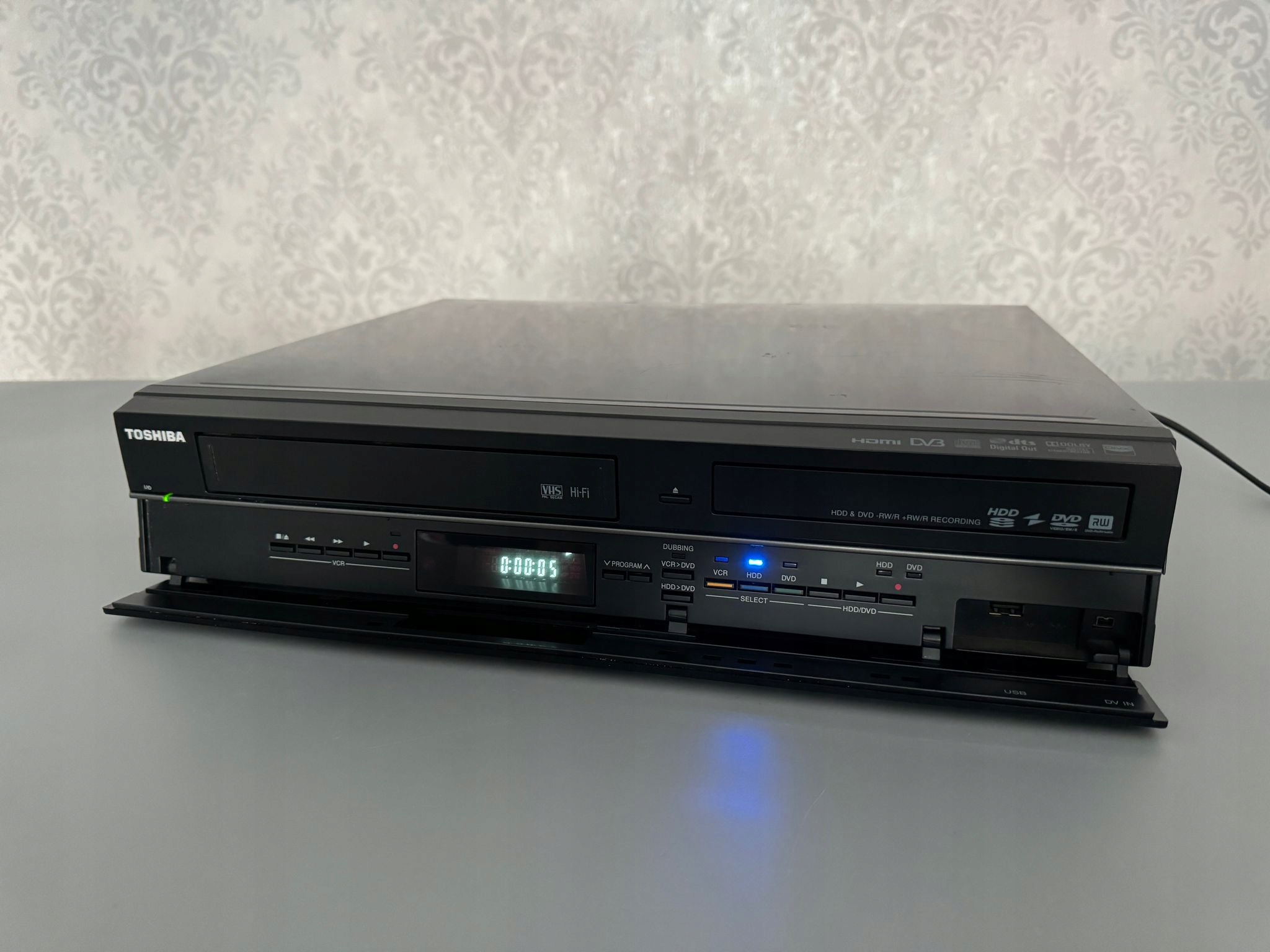 Уникальный Toshiba All-In-One Combine Combine Harvester. Одна из самых высоких и самых передовых моделей этого производителя, которая когда -то конкурировала с самыми дорогими моделями Panasonic и технически соответствовала им. Это позволяет записывать на созданный диск, играть и записывать DVD -диски и играть в кассеты VHS. Угородность возможностей при сохранении простоты обслуживания. Следовательно, он может заменить три других устройства одновременно.