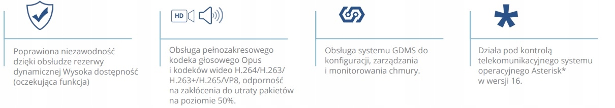 - Кодеки голоса и факса: Opus, G .711 A -закон/U-закон, G.722, G722.1 G722.1C, G.723.1 5.3K/6.3K, G.726-32, G.729A/B, iLBC, GSM; T.38