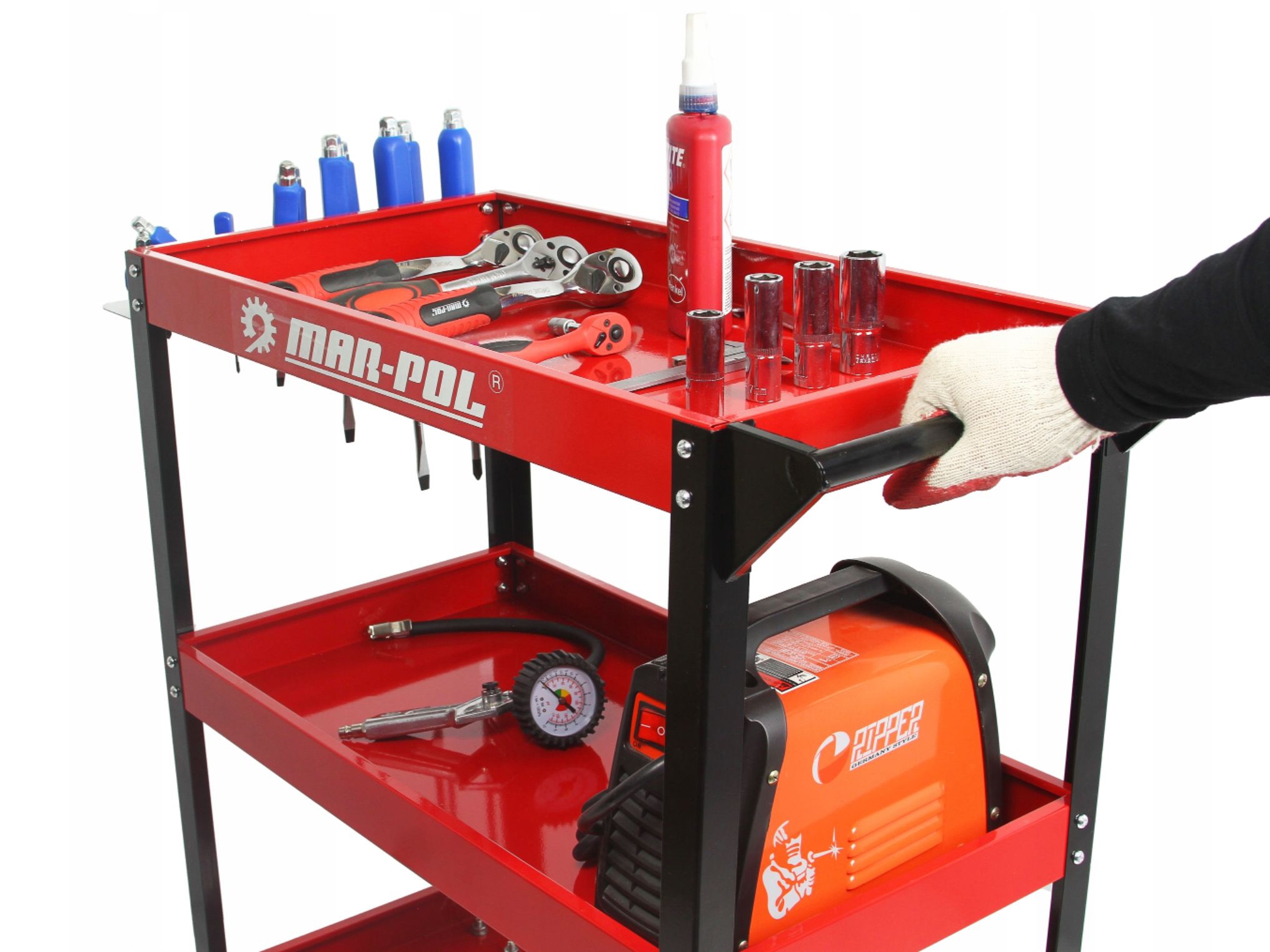 Стальная коляска с тремя полками. Он идеально подходит для семинаров, услуг, а также является хорошим решением для DIY. Облегчает работу, потому что у вас всегда есть каждый инструмент под рукой. Он оснащен четырьмя колесами с двумя постоянными и двумя кругами и металлической ручкой, что облегчает перемещение. Коляска также может быть использована для транспортировки небольших пакетов.